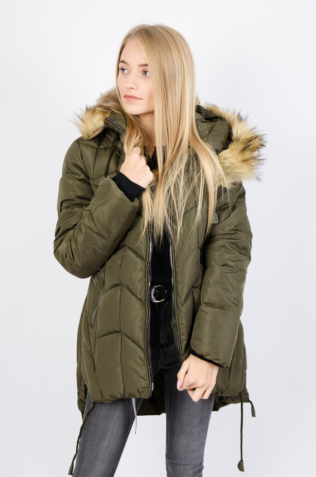 Zielona pikowana kurtka wiązana po bokach.