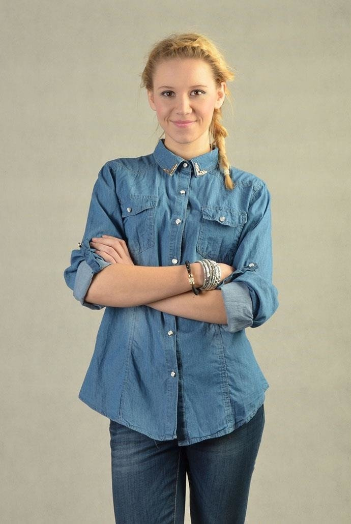 Koszula jeansowa, zapinana na ozdobne guziki, na kołnierzyku złote blaszki. Idealna do wielu codziennych stylizacji.