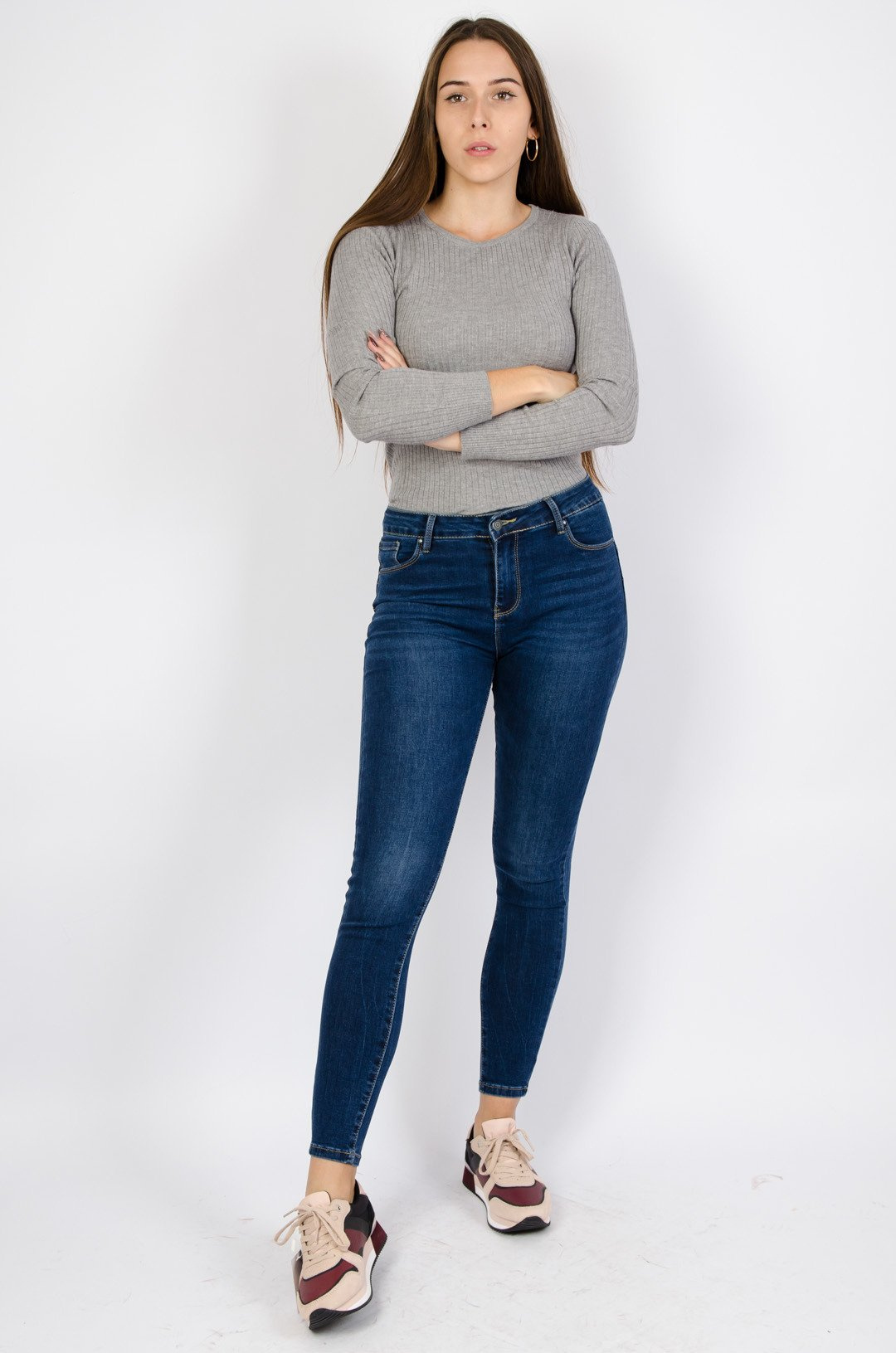Szary dopasowany sweter z prążkowanej dzianiny.