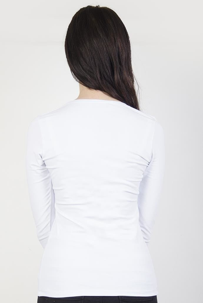 Klasyczna, gładka bluzka z długim rękawem oraz dekoltem w serek. Idealnie sprawdzi się jako baza wielu codziennych stylizacji.