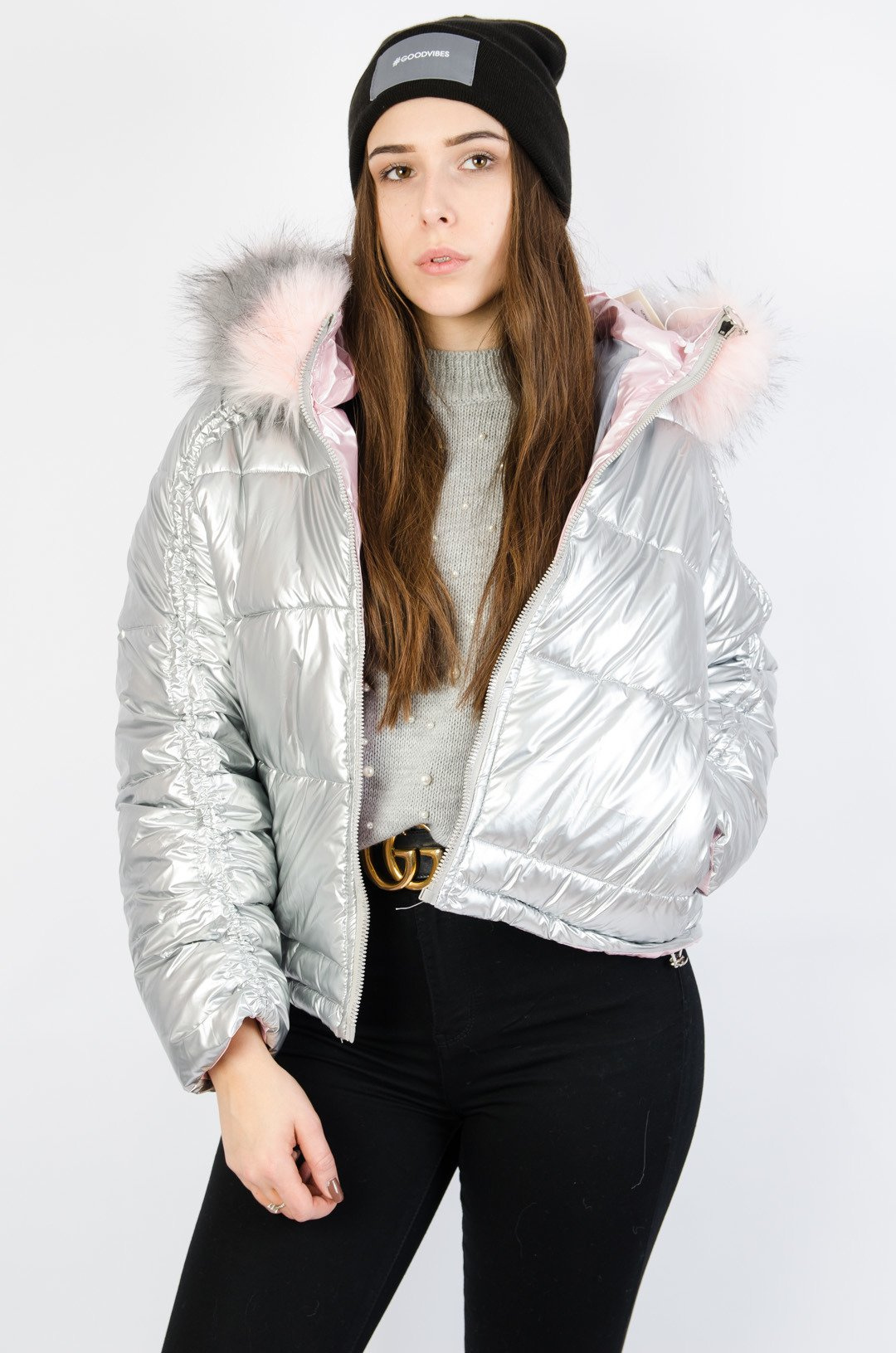 Srebrna metaliczna bomberka z dwukolorowym futerkiem.