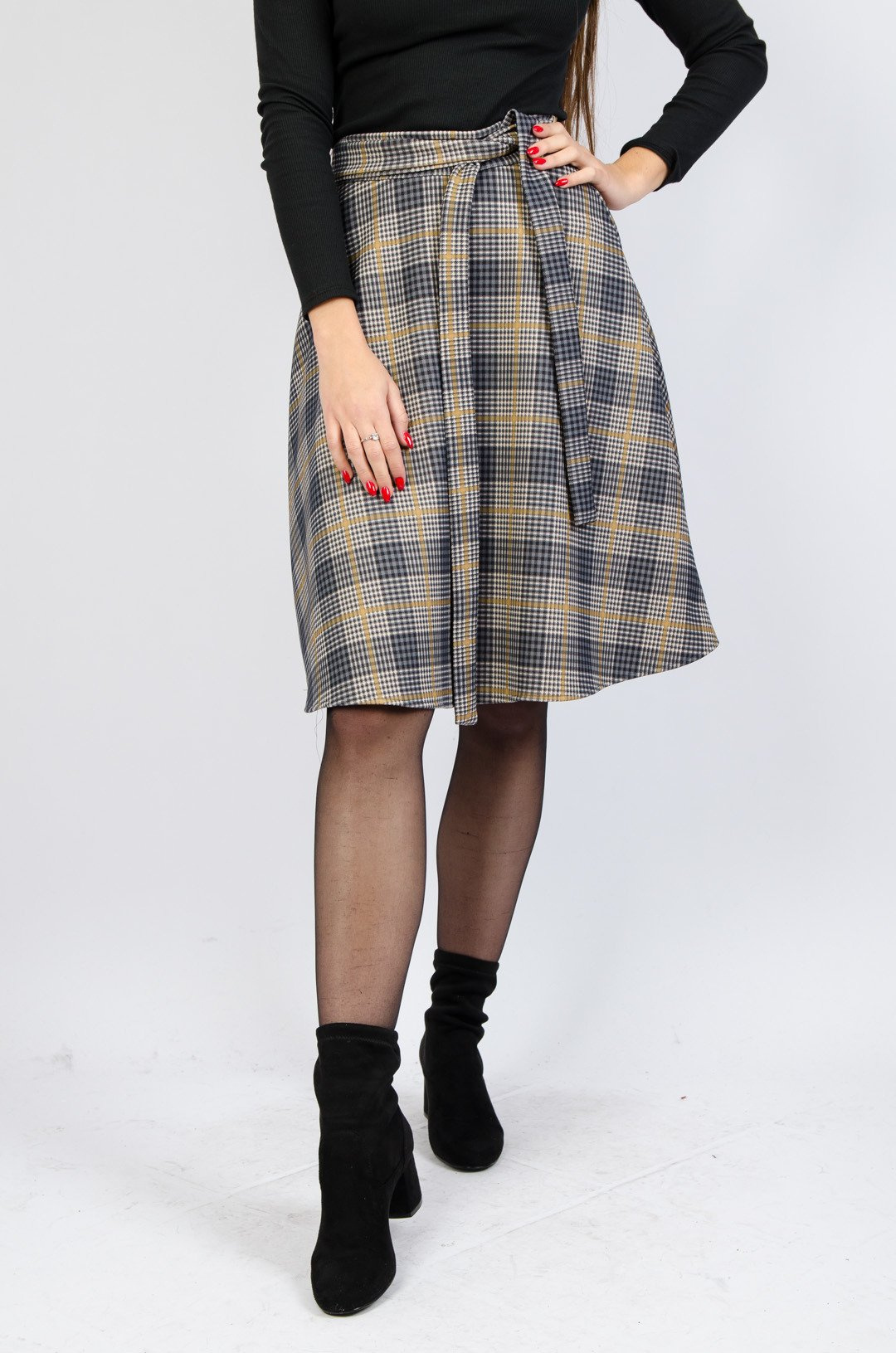 Spódnica midi w granatową kratę z wiązaniem w pasie