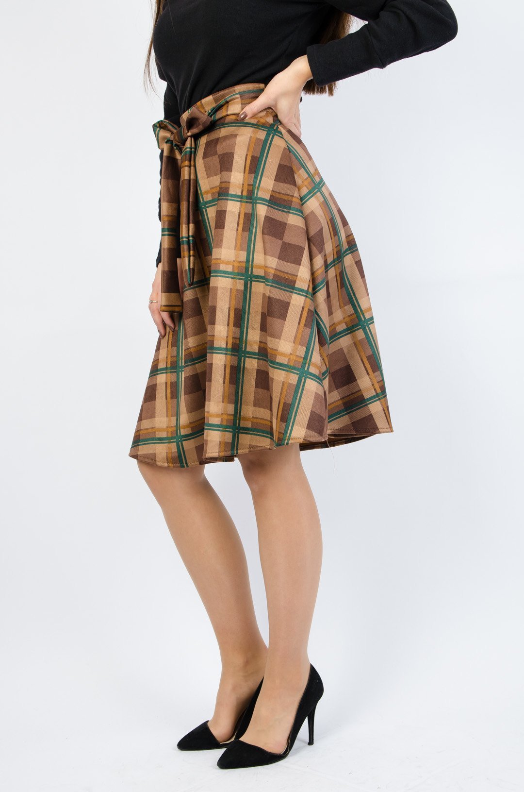 Spódnica midi w brązową kratę z wiązaniem w pasie