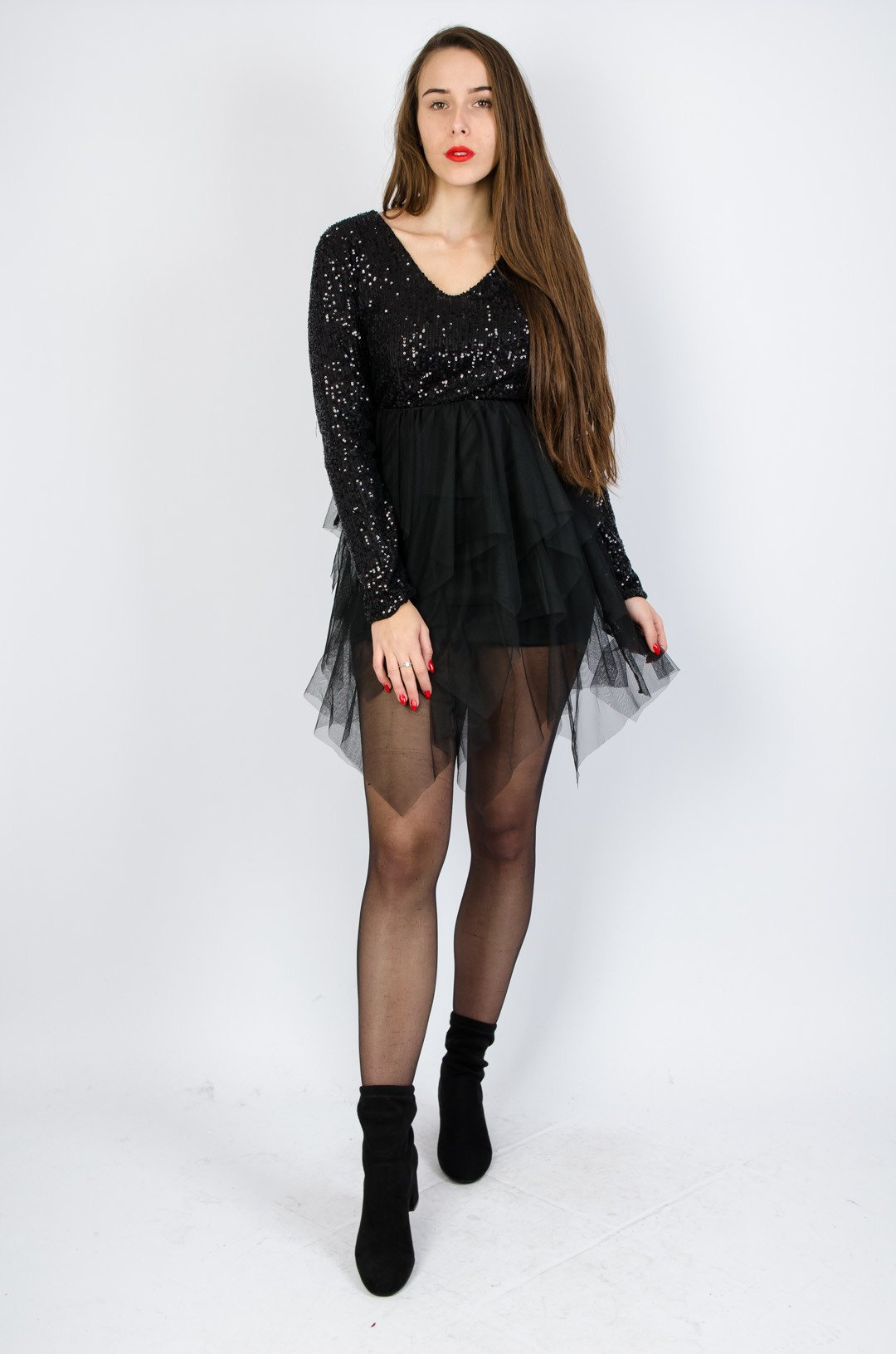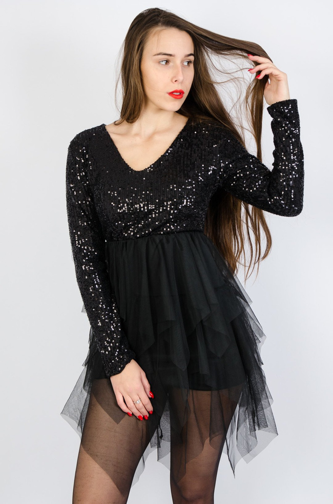 CZARNA TIULOWA SUKIENKA Z CEKINAMI