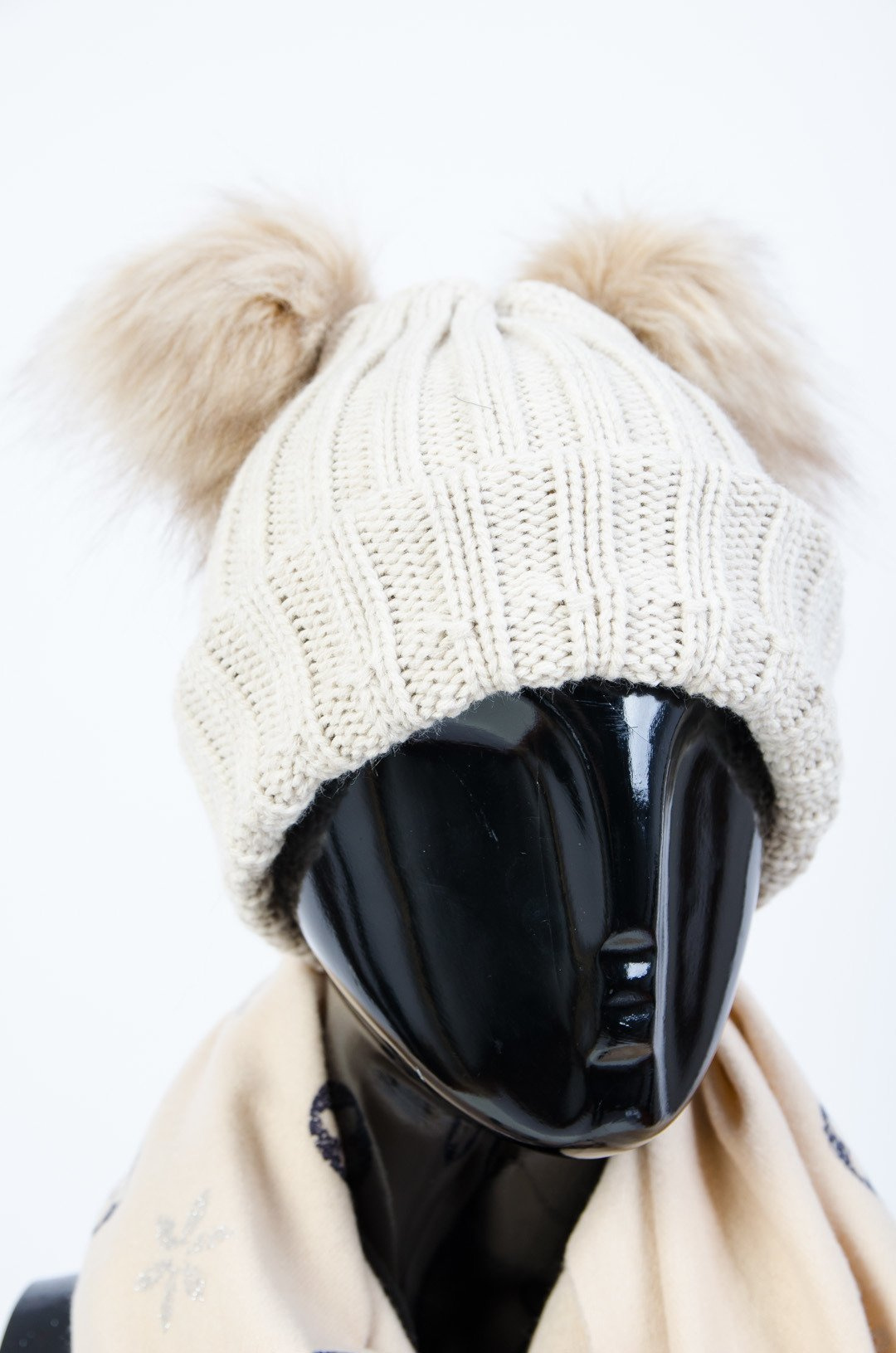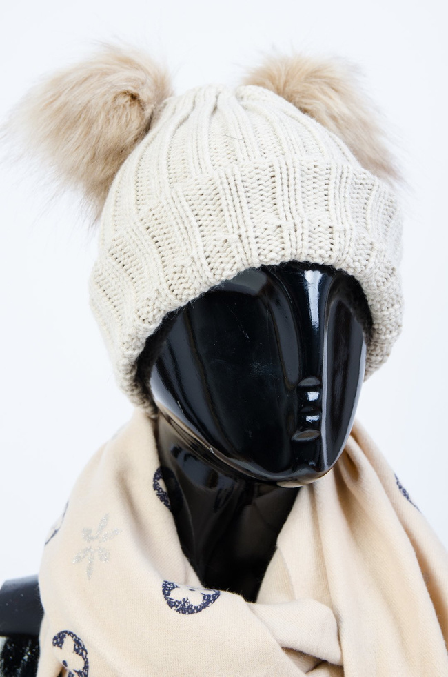BEŻOWA ZIMOWA CZAPKA Z DWOMA POMPONAMI