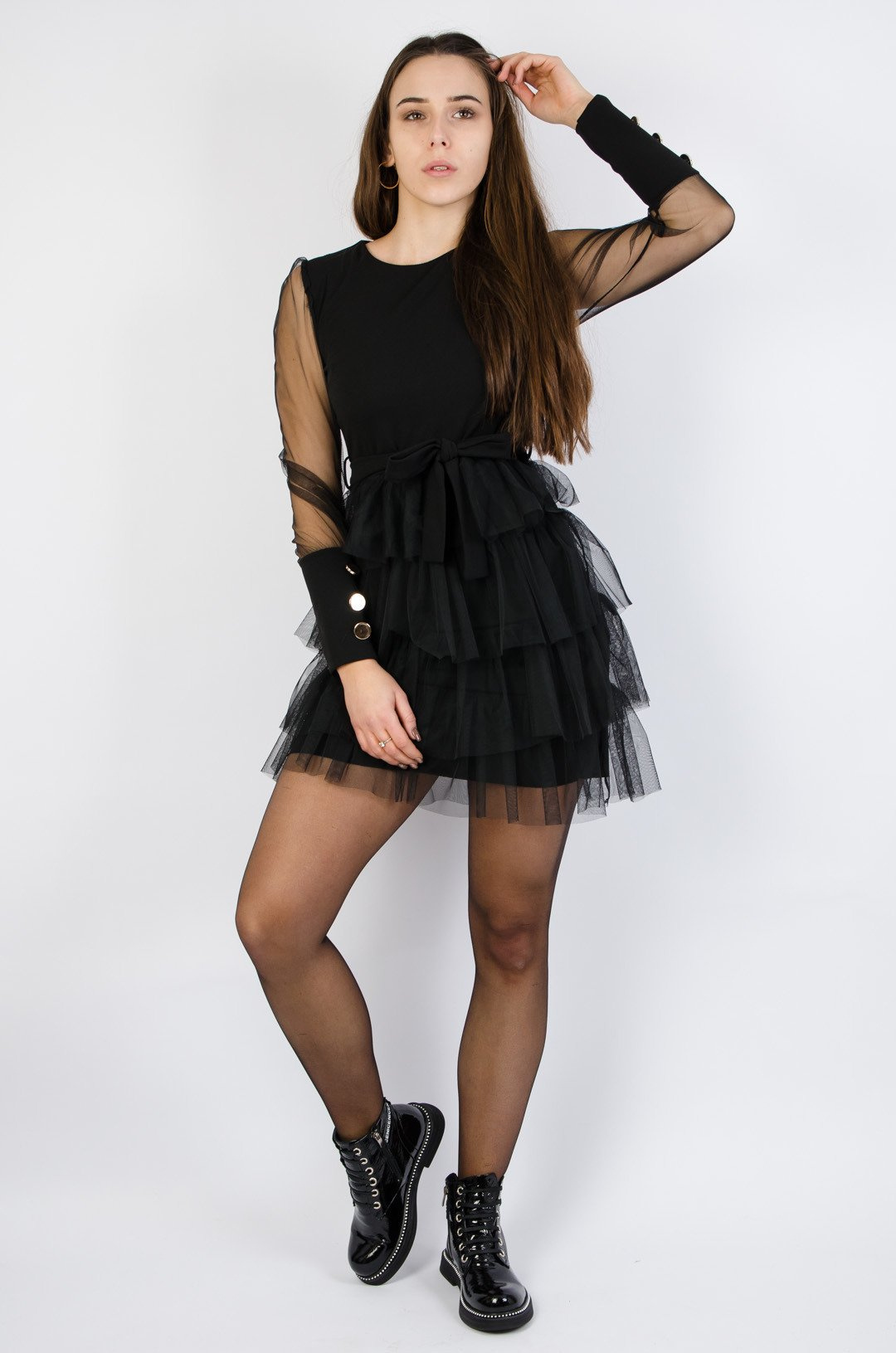 Czarna sukienka z tiulowym dołem i bufiastymi rękawami