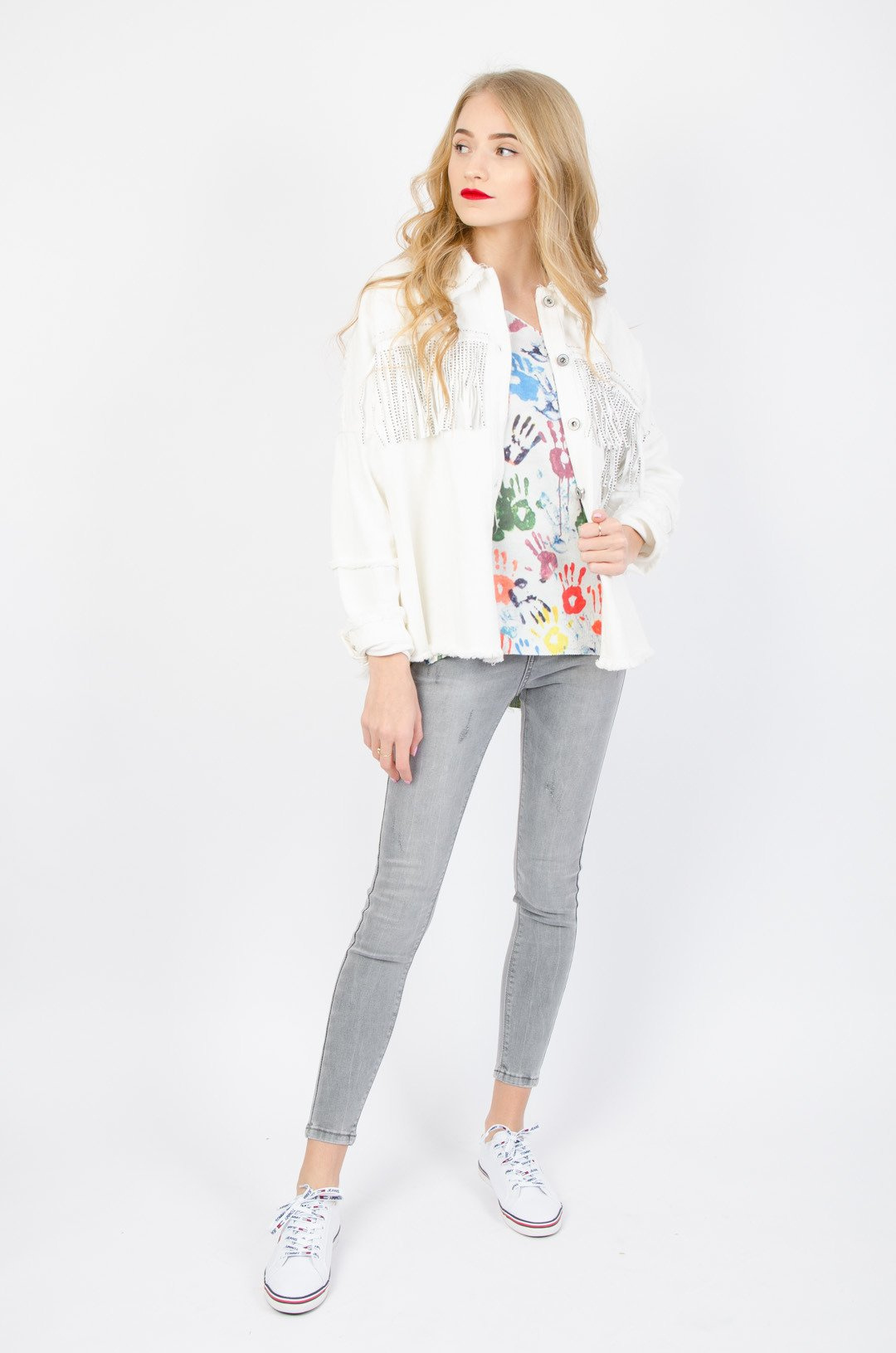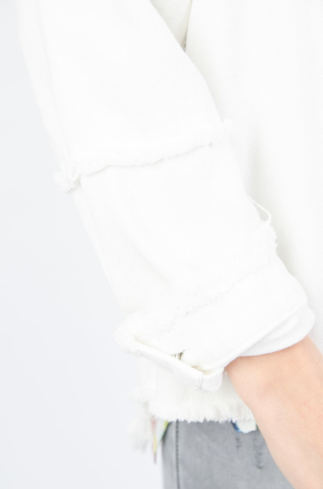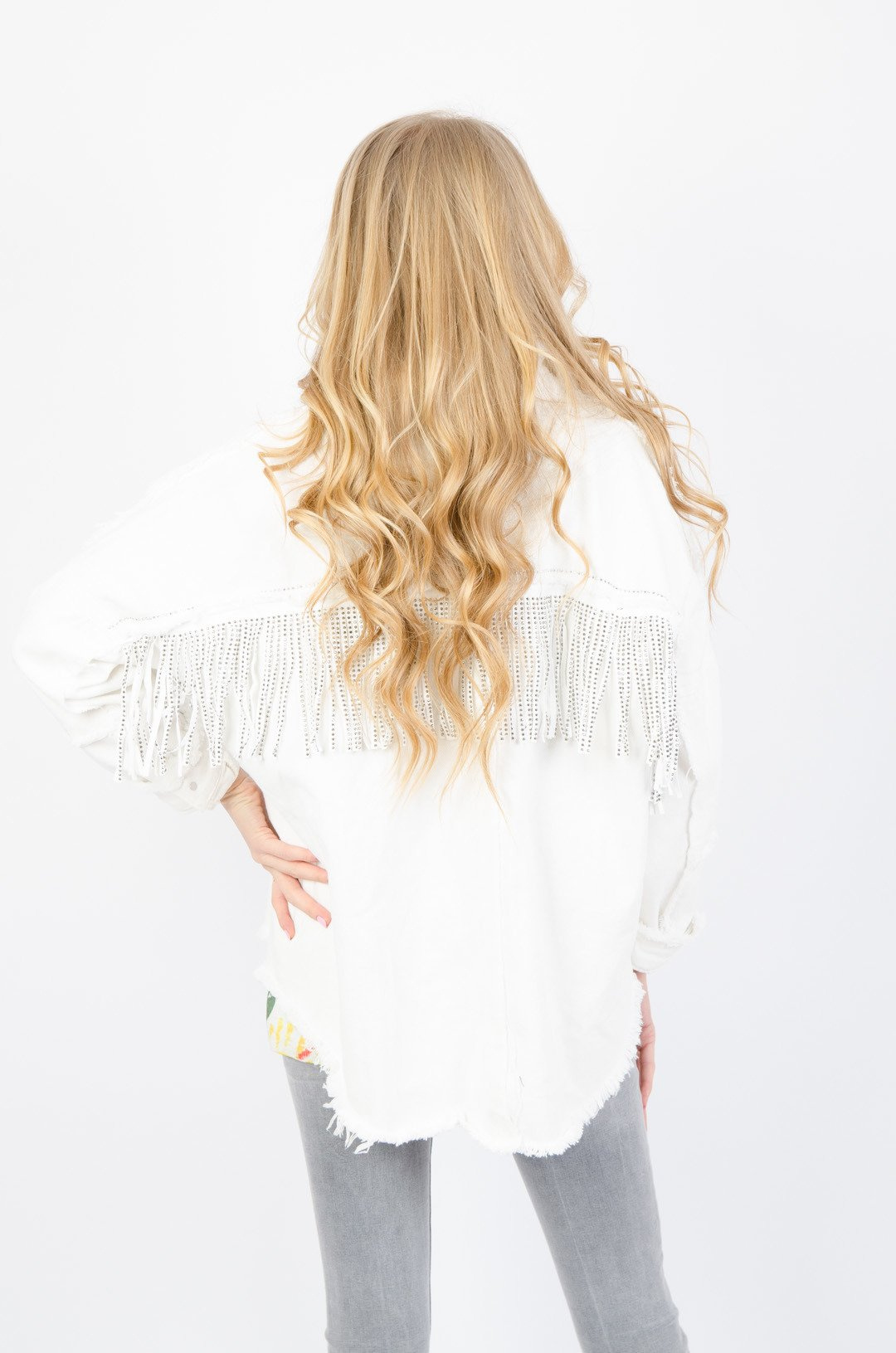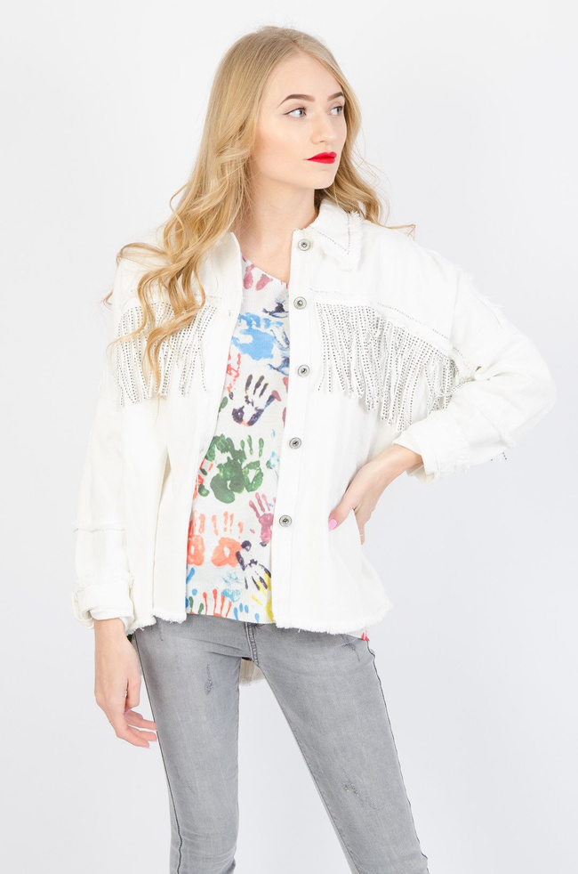 BIAŁA KURTKA JEANSOWA OVERSIZE Z FRĘDZLAMI