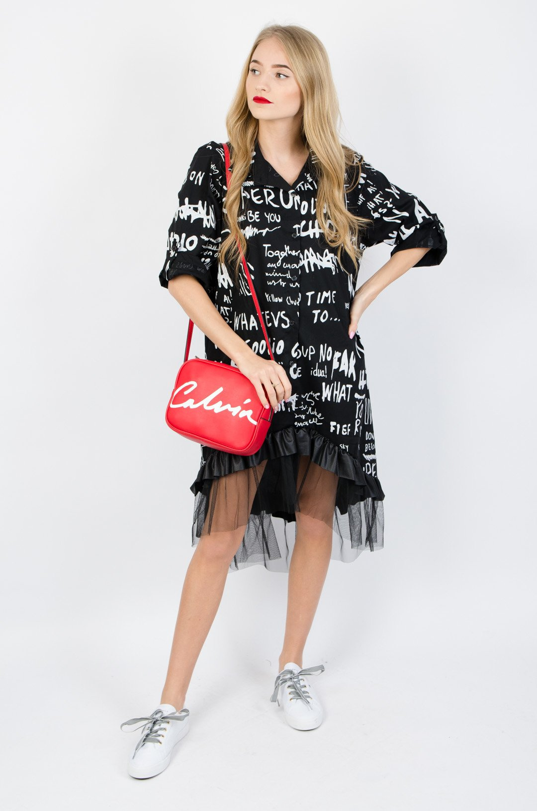 CZARNA KOSZULOWA SUKIENKA/TUNIKA Z NAPISAMI