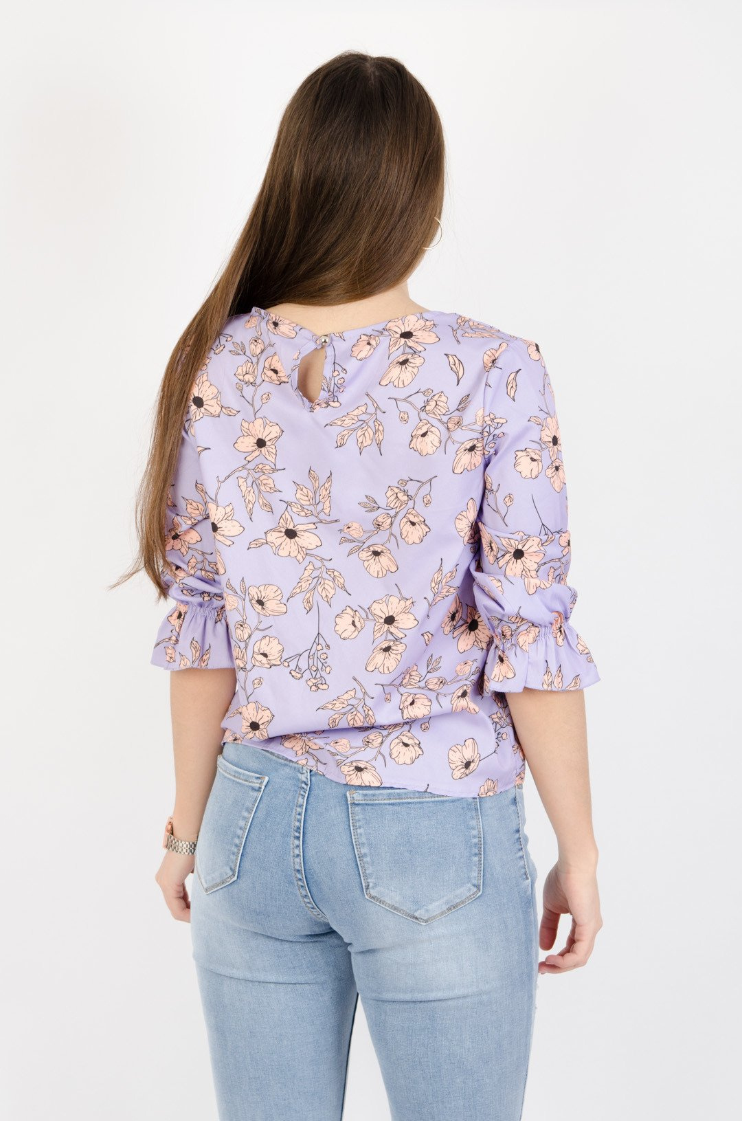 Fioletowa bluzka w pomarańczowe kwiaty z falbaną