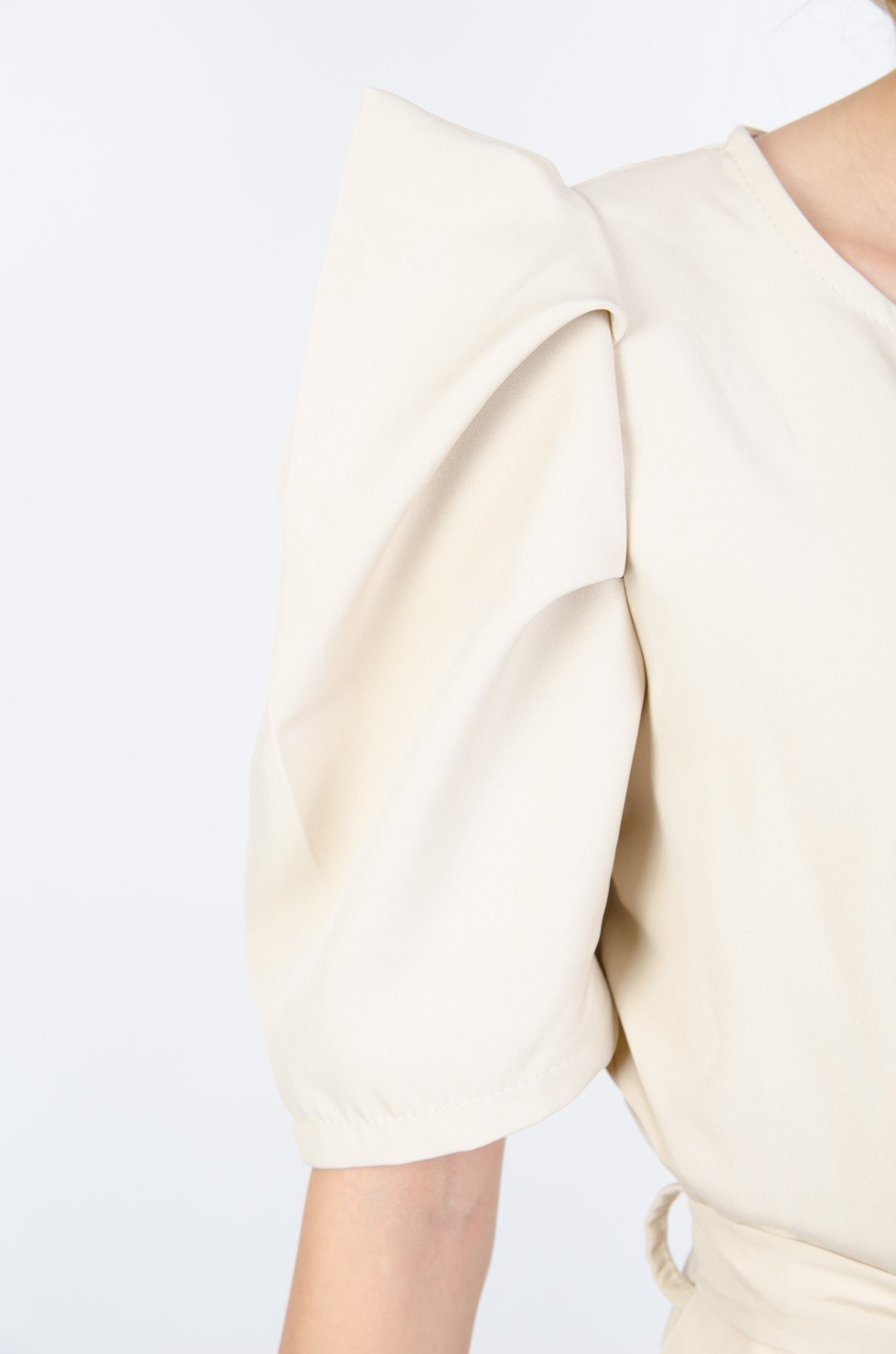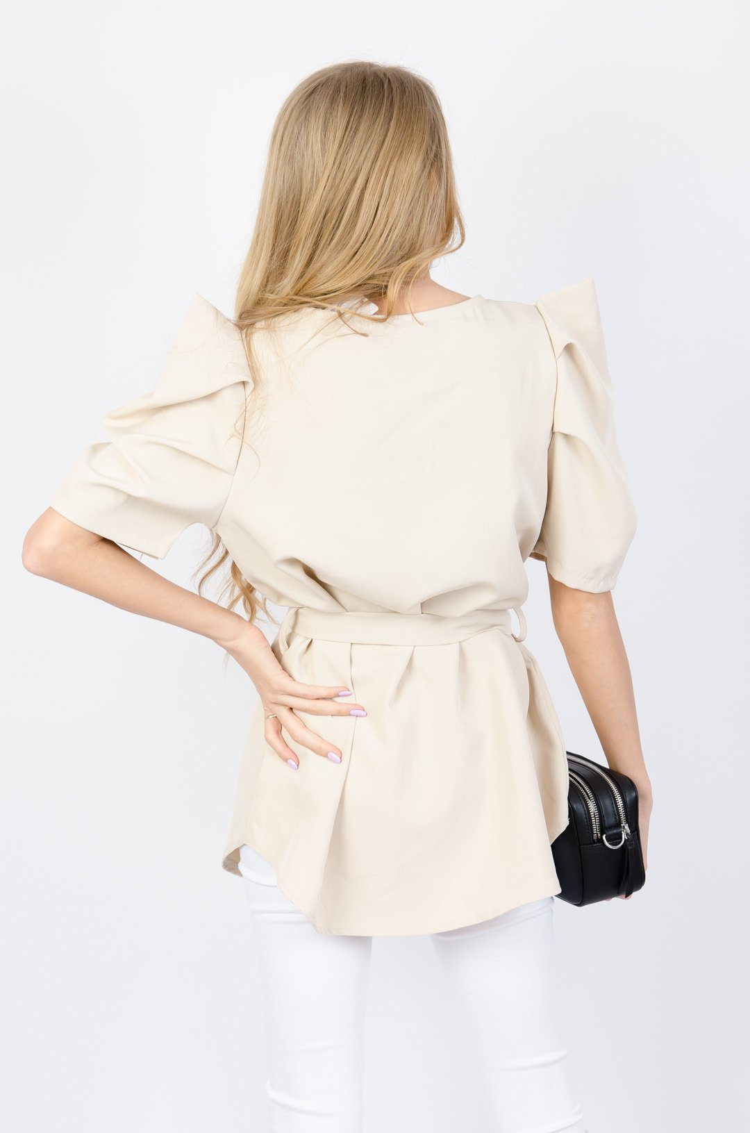 BEŻOWA BLUZKA Z BUFIASTYMI RĘKAWAMI WIĄZANA W PASIE