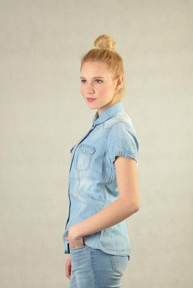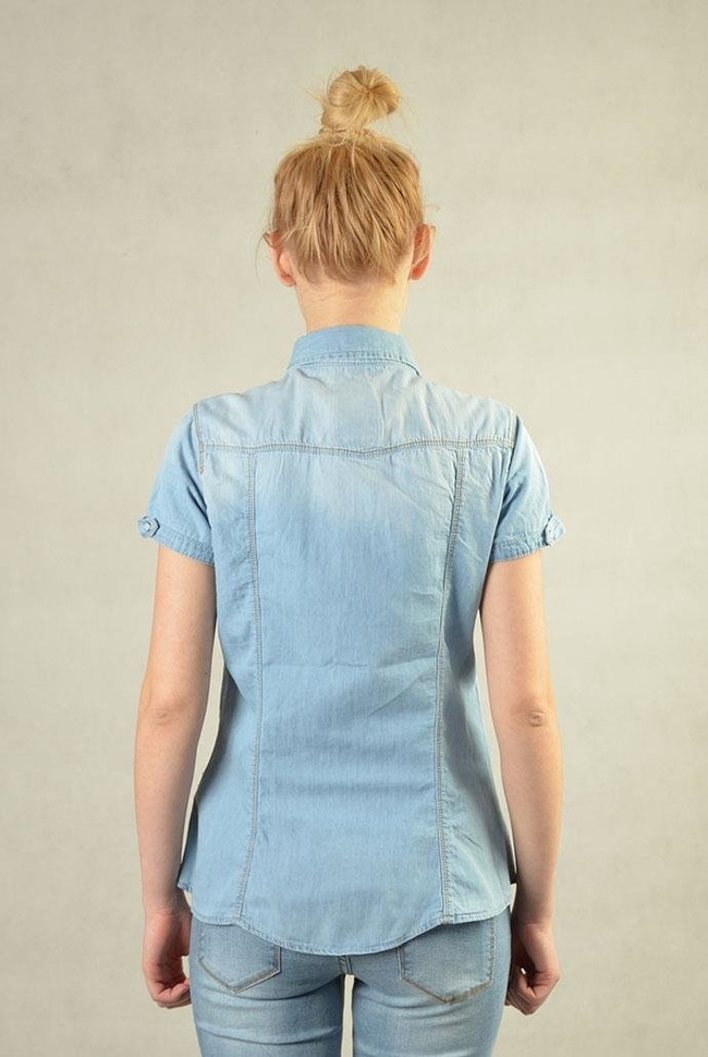 Koszula jeansowa, z krótkim rękawkiem zapinana na zatrzaski. Z przodu dwie kieszonki.