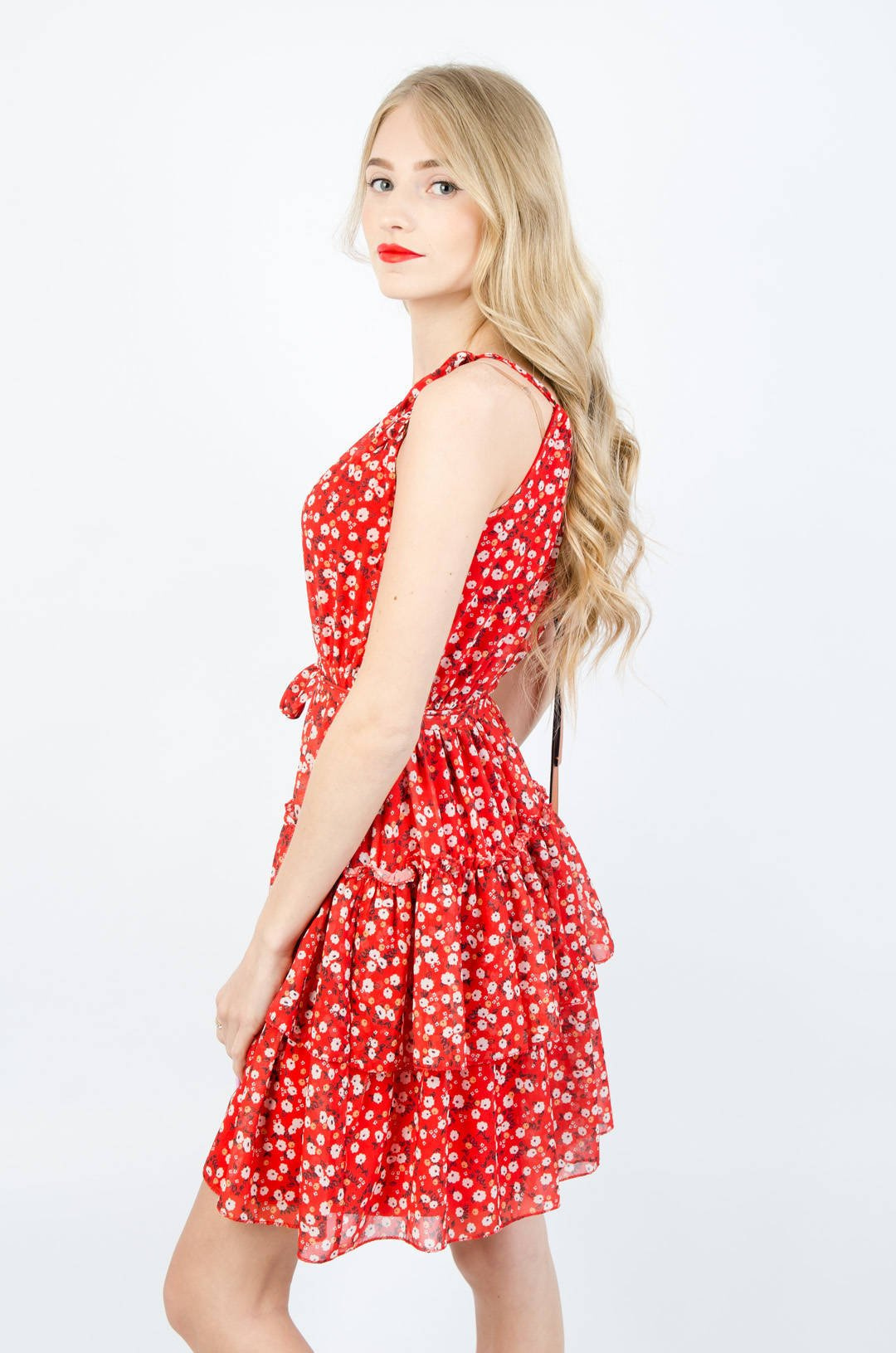 CZERWONA SUKIENKA Z FALBANAMI W DROBNE KWIATY