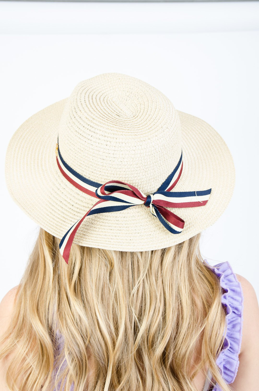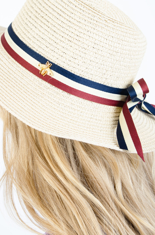 BEŻOWY SŁOMKOWY KAPELUSZ Z OZDOBNĄ WSTĄŻKĄ