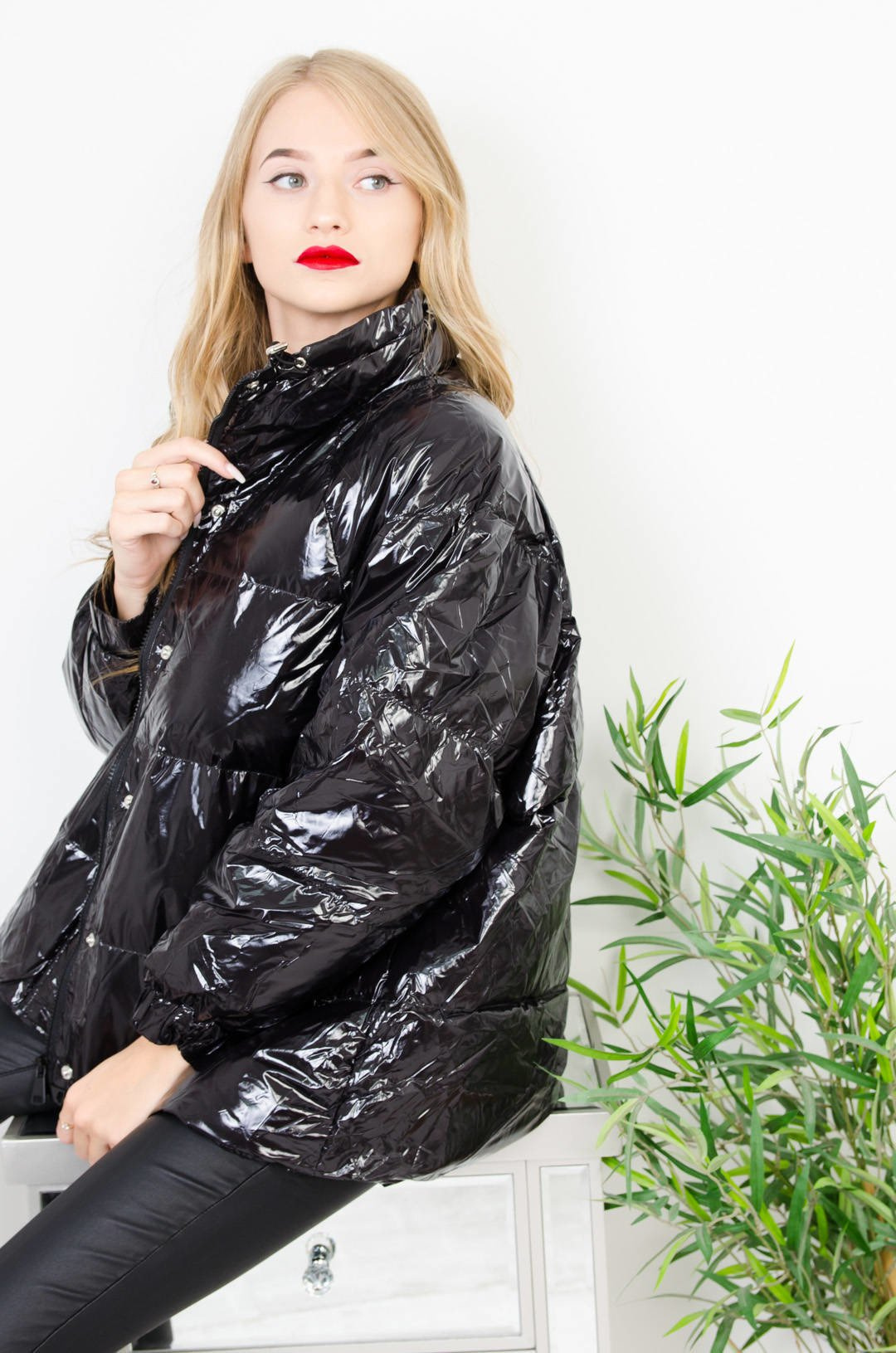 CZARNA POŁYSKUJĄCA WINYLOWA KURTKA ZE STÓJKĄ