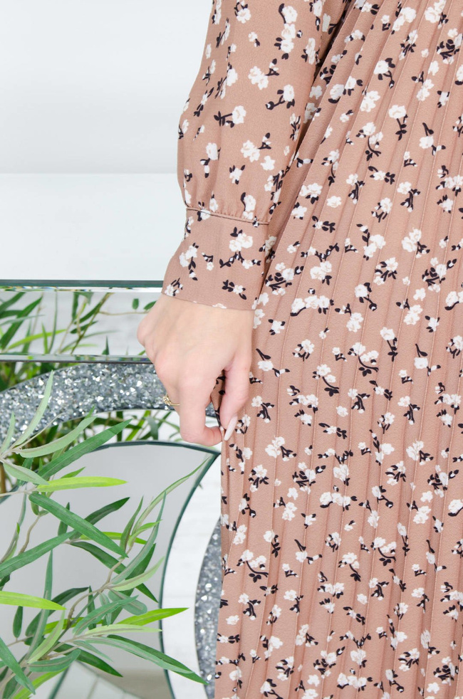 BEŻOWA SUKIENKA W BIAŁE KWIATY Z PLISOWANYM DOŁEM
