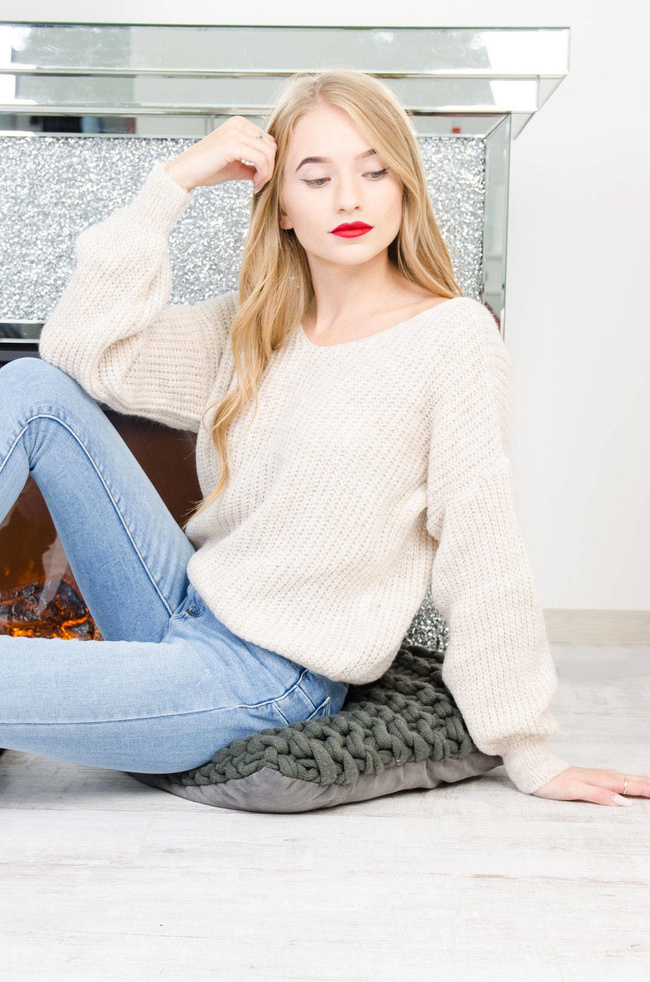 KRÓTKI BEŻOWY SWETER Z DEKOLTEM W SZPIC