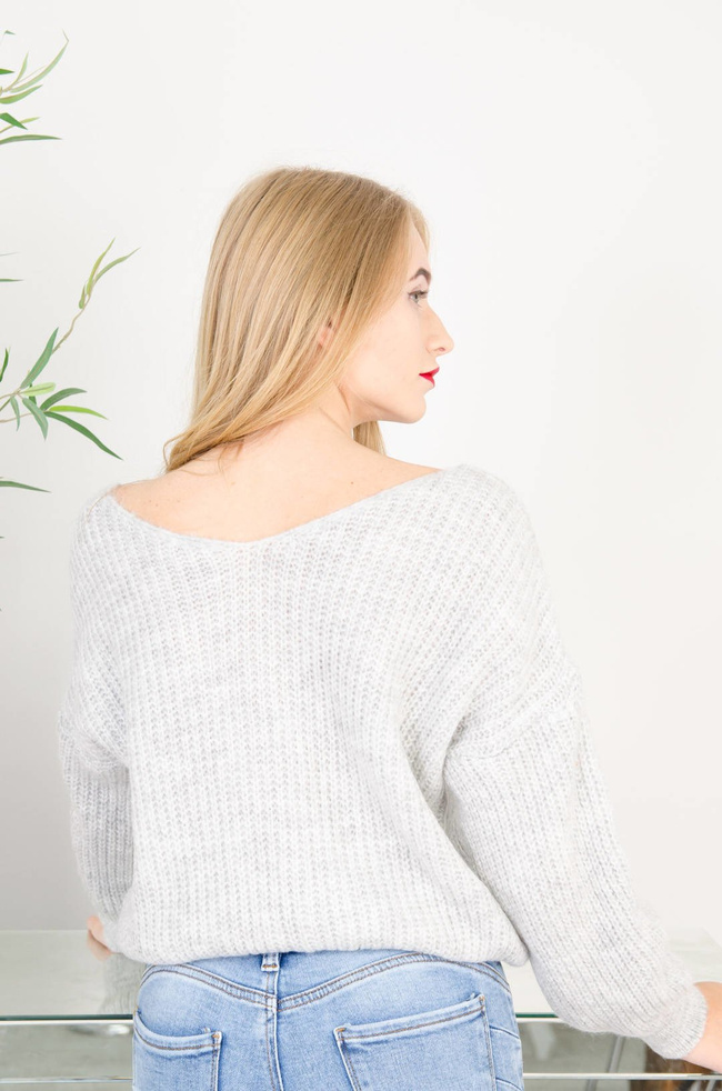 KRÓTKI SZARY SWETER Z DEKOLTEM W SZPIC