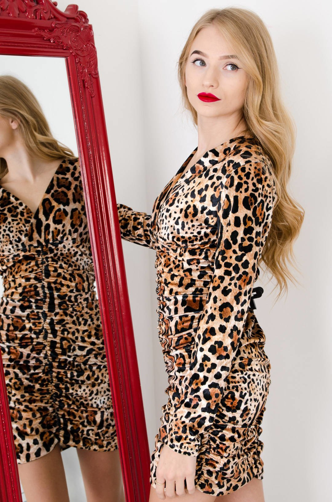 WELUROWA SUKIENKA W PANTERKĘ Z KOPERTOWYM DEKOLTEM