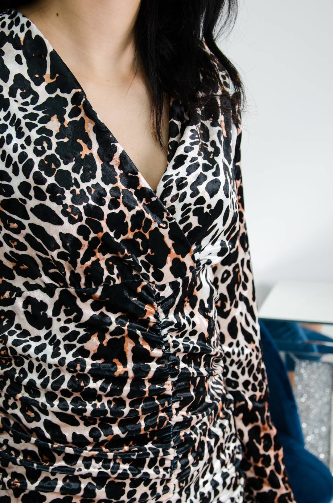 WELUROWA SUKIENKA W PANTERKĘ Z KOPERTOWYM DEKOLTEM