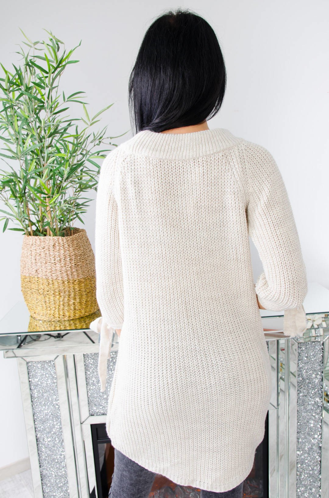 DŁUGI BEŻOWY SWETER-SUKIENKA Z WIĄZANIEM NA RĘKAWACH