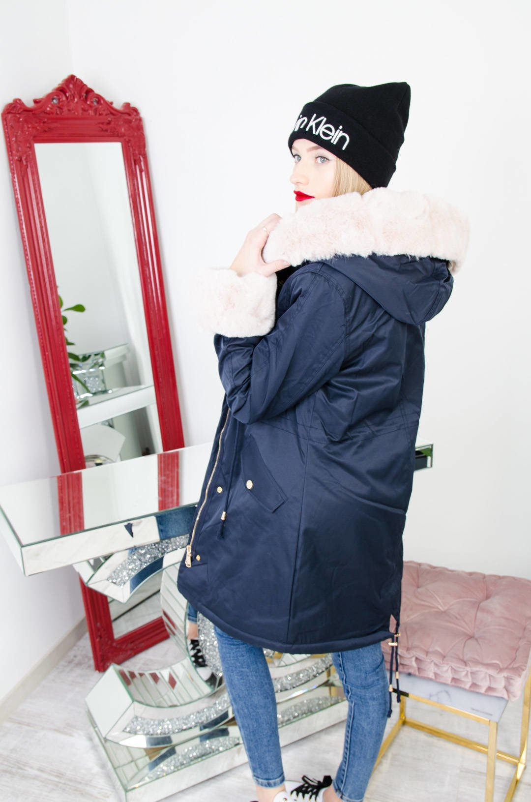 GRANATOWA ZIMOWA KURTKA PARKA Z BEŻOWYM FUTERKIEM