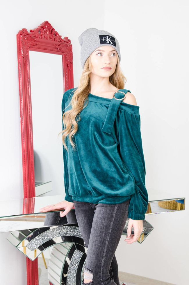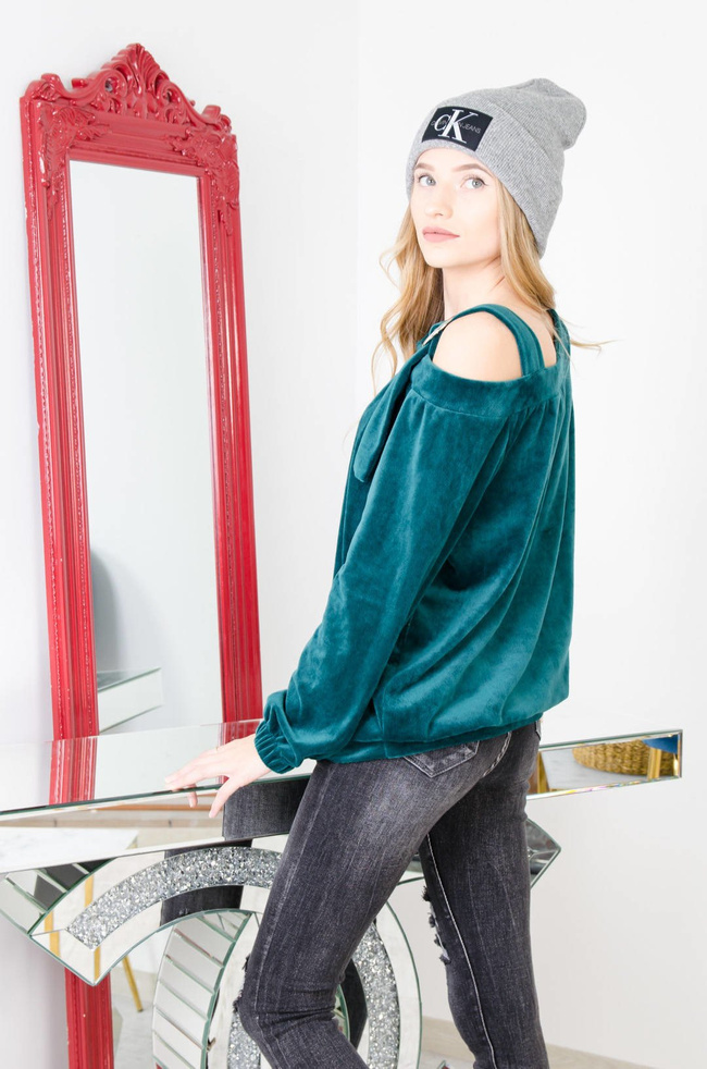 ZIELONA WELUROWA BLUZKA Z WYCIĘCIEM NA RAMIENIU