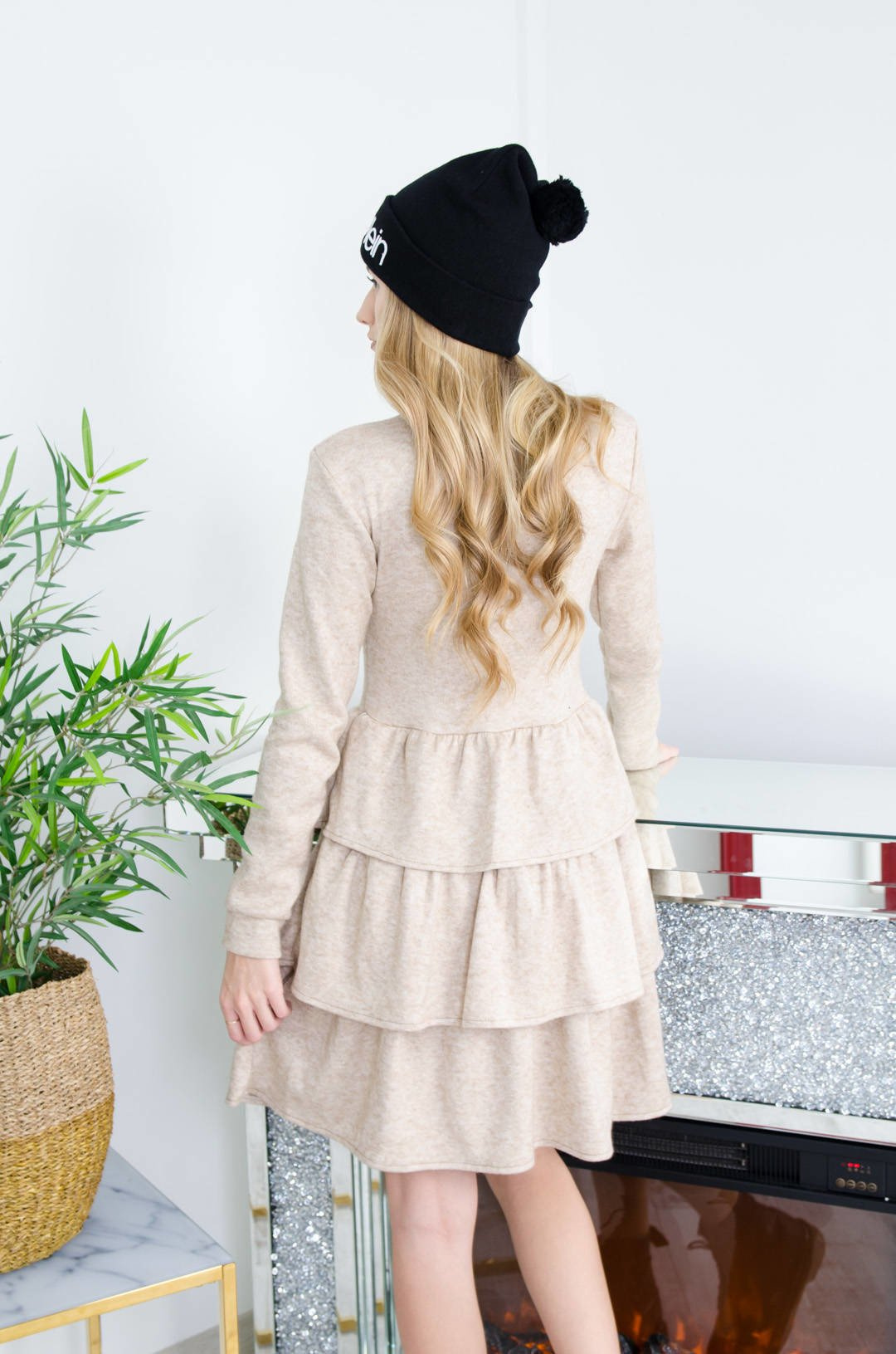 BEŻOWA ROZKLOSZOWANA SUKIENKA Z FALBANAMI