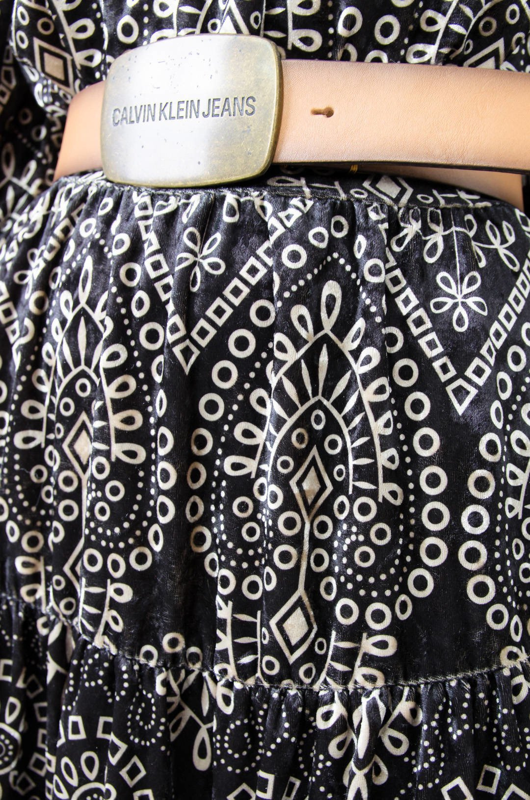 CZARNA WELUROWA SUKIENKA W ZŁOTE WZORY.