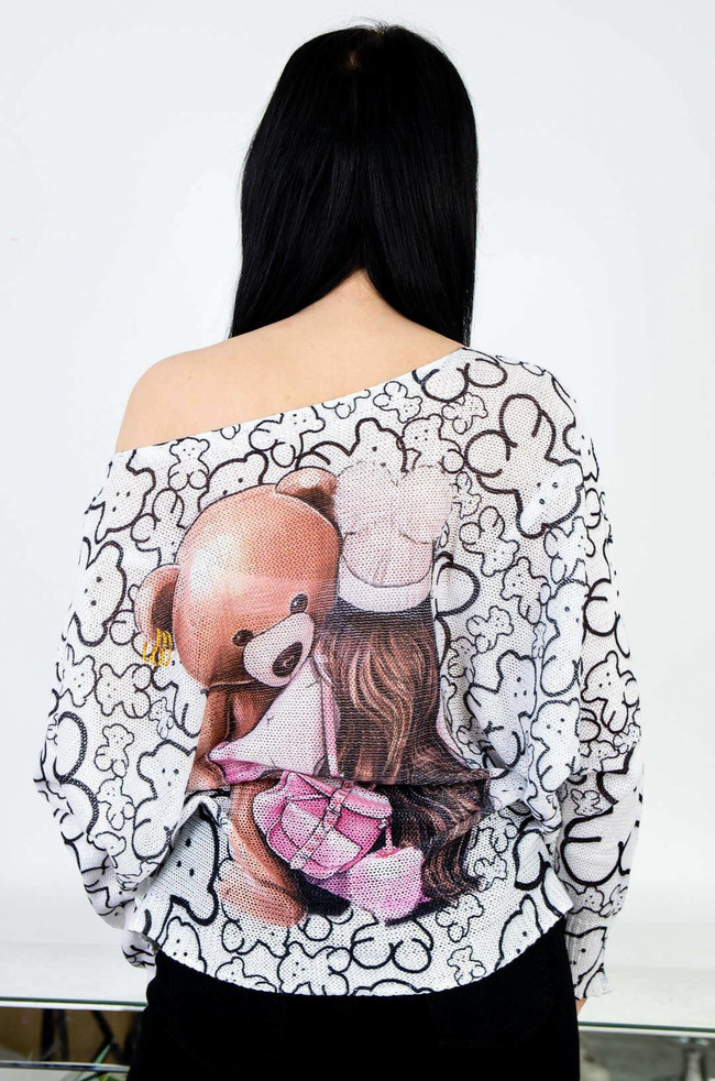 BIAŁA LUŹNA BLUZKA Z MOTYWEM KOBIETY Z MISIEM