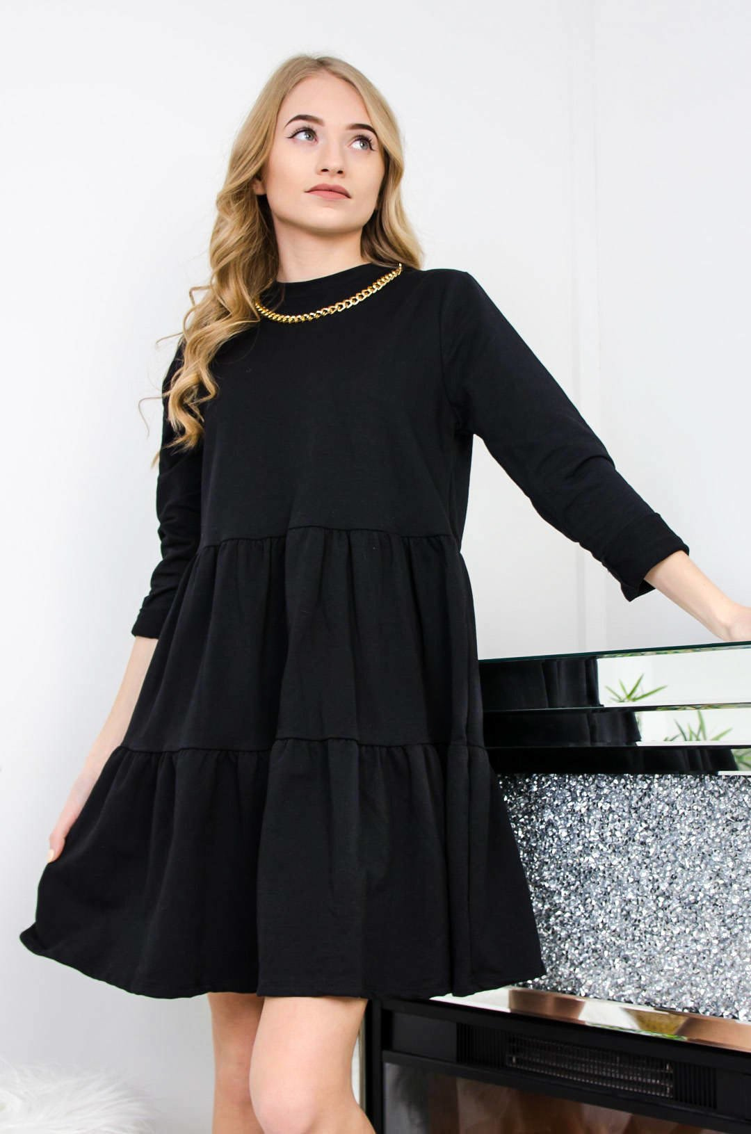 CZARNA ROZKLOSZOWANA SUKIENKA ZE ZŁOTYM ŁAŃCUSZKIEM
