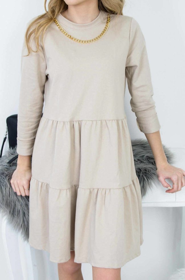 BEŻOWA ROZKLOSZOWANA SUKIENKA ZE ZŁOTYM ŁAŃCUSZKIEM