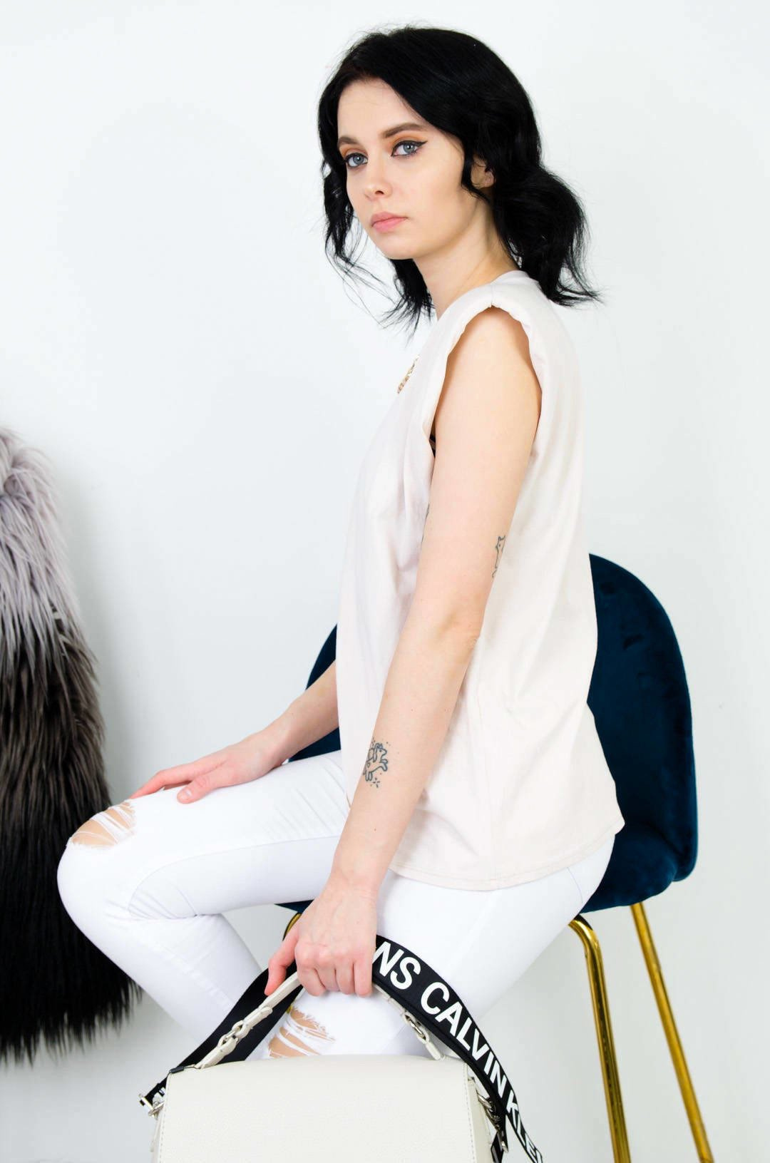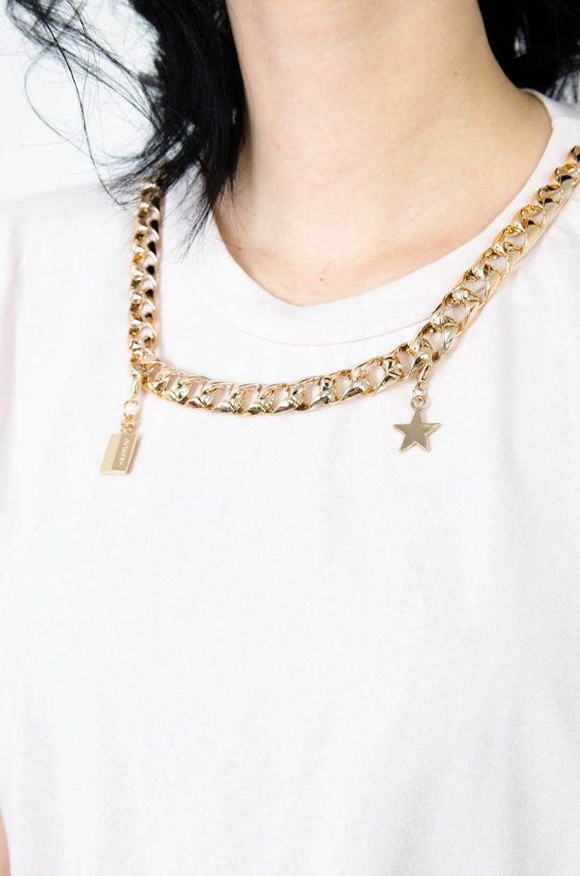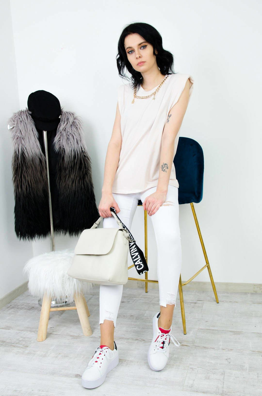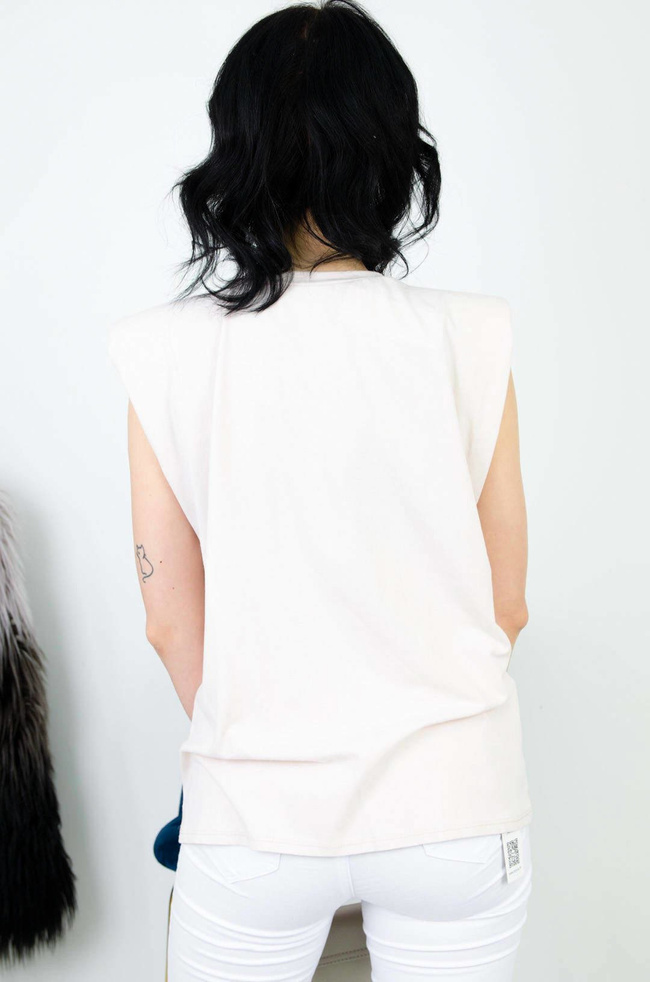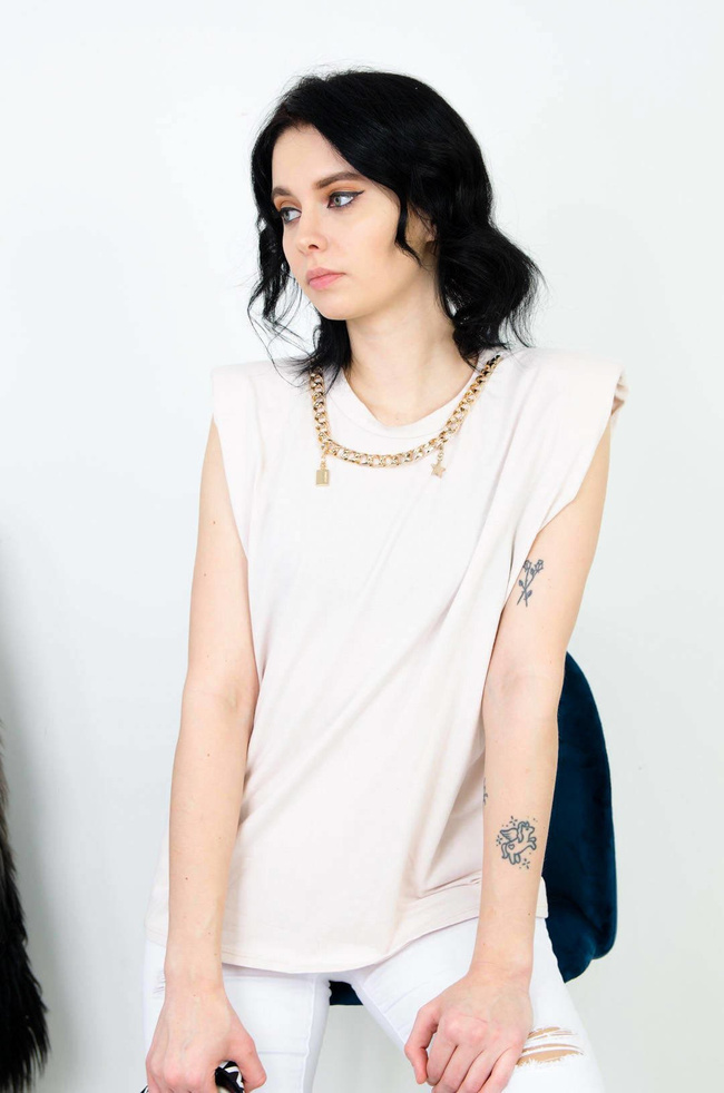 BEŻOWA BAWEŁNIANA BLUZKA BEZ RĘKAWÓW ZE ZŁOTYM ŁAŃCUSZKIEM