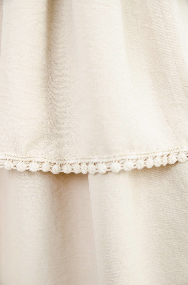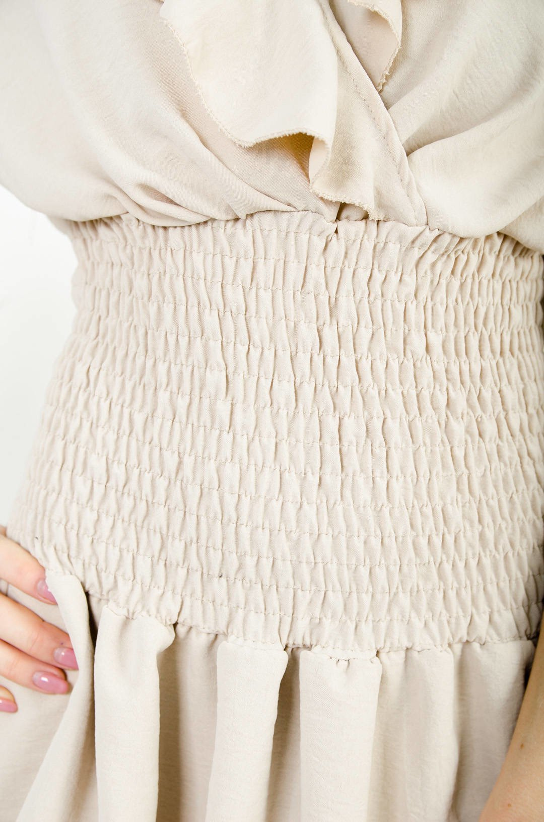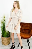 BEŻOWA SUKIENKA Z FALBANAMI I SZEROKIM ŚCIĄGACZEM W PASIE
