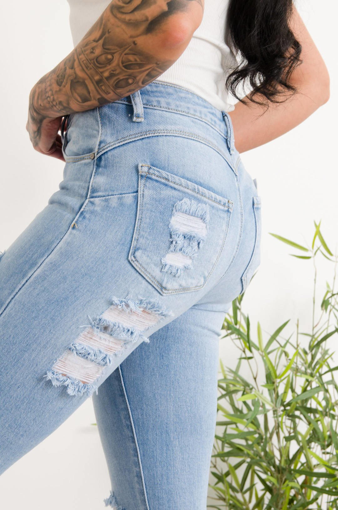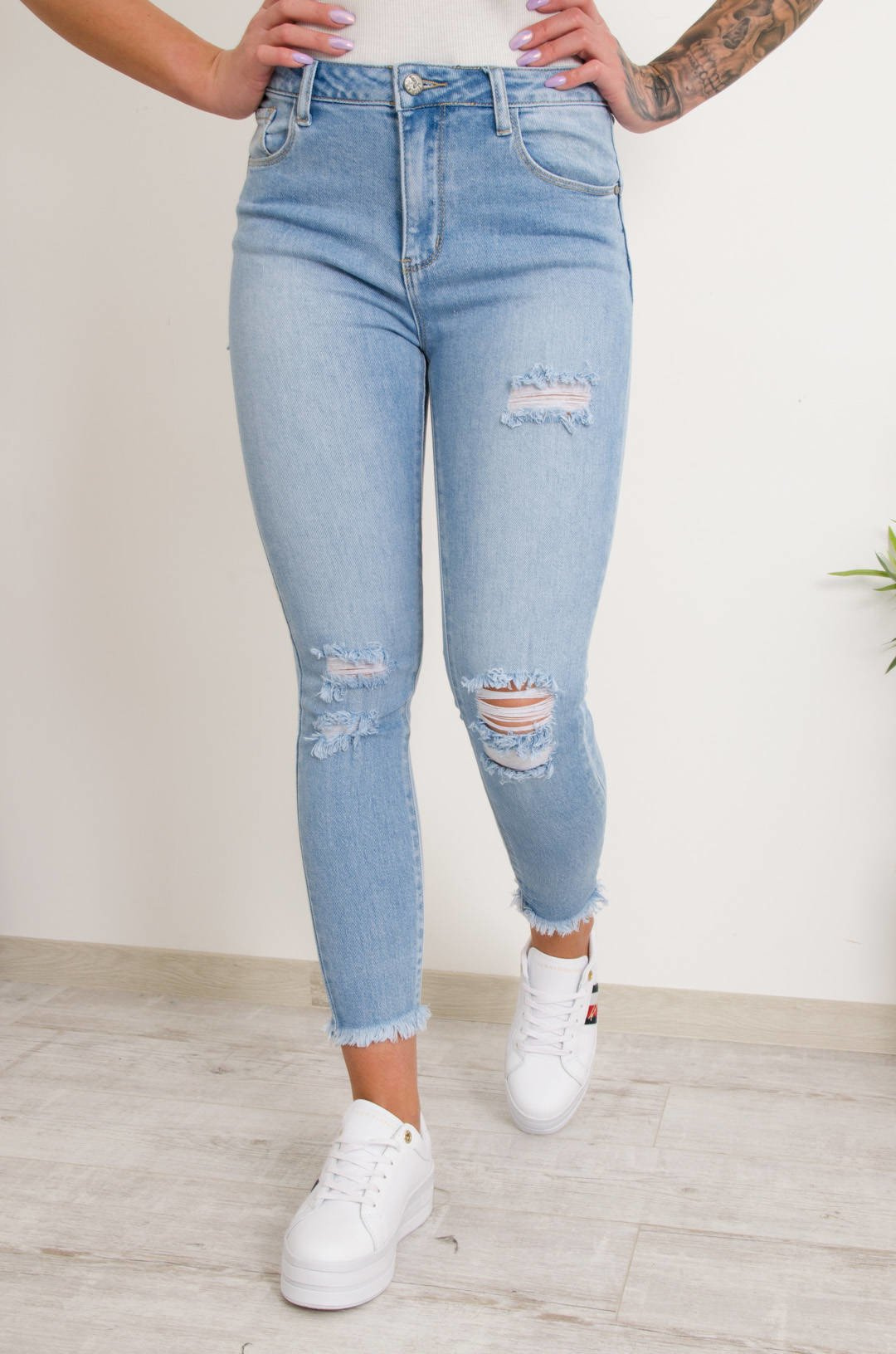 JASNE SPODNIE JEANSOWE Z DZIURAMI PRZÓD TYŁ