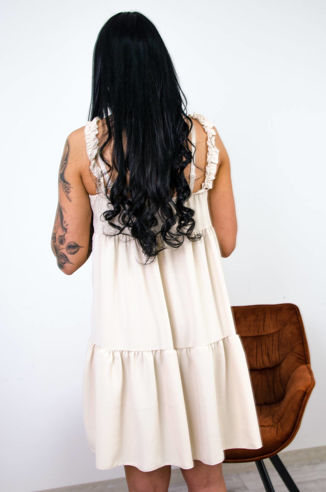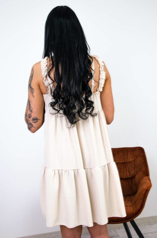 BEŻOWA LUŹNA SUKIENKA Z FALBANKĄ NA RAMIĄCZKACH