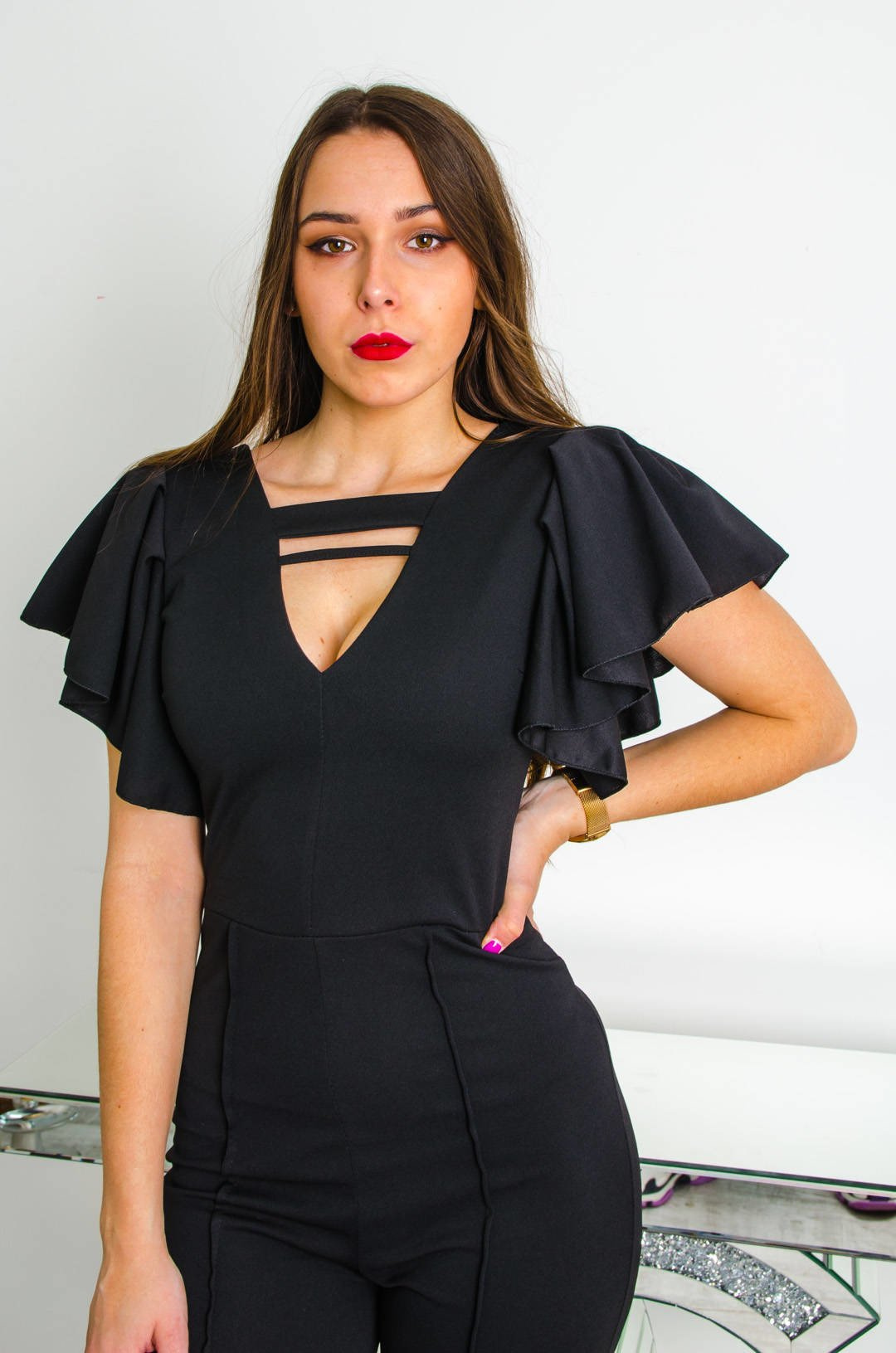 CZARNY KOMBINEZON Z FALBANĄ W RAMIONACH-WYCIĘCIE W DEKOLCIE I PLECACH " V"