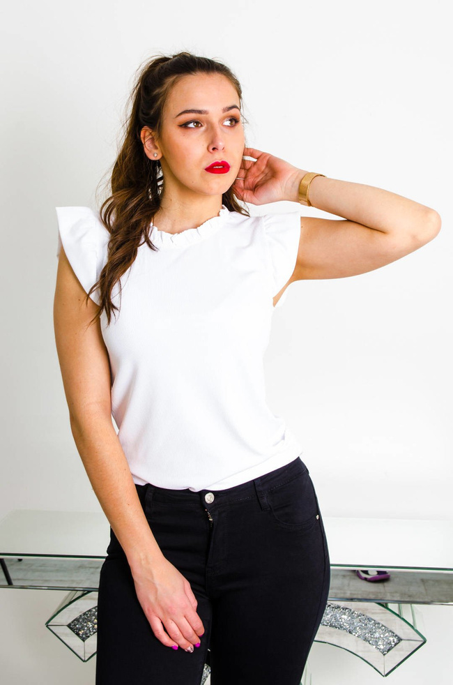 BIAŁA PRĄŻKOWANA BLUZKA Z FALBANKĄ PRZY SZYI I RĘKAWACH