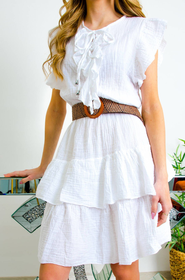 BIAŁA WARSTWOWA SUKIENKA Z MARSZCZONEGO MATERIAŁU.