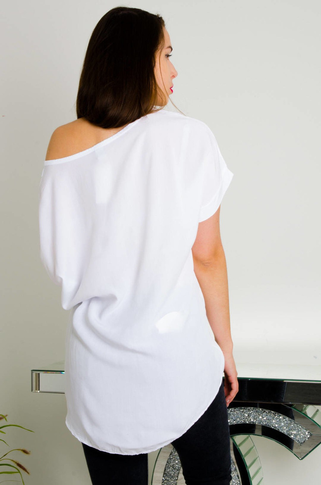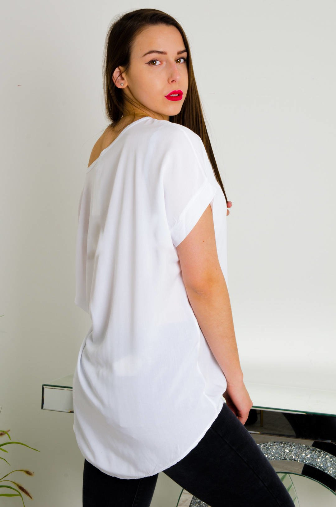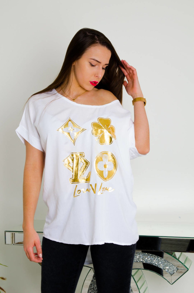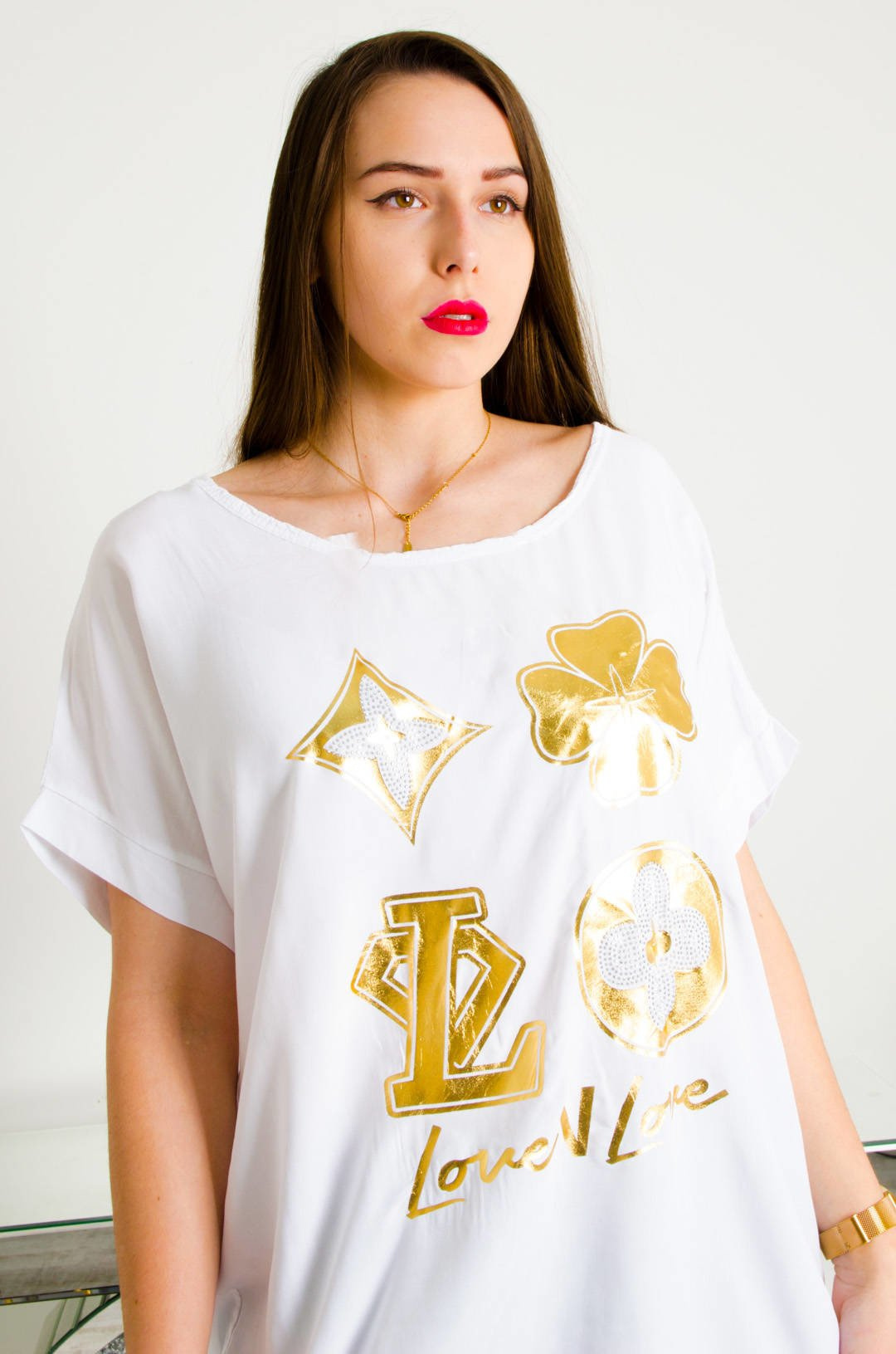 BIAŁA BLUZKA ZE ZŁOTĄ APLIKACJĄ I NAPISAMI