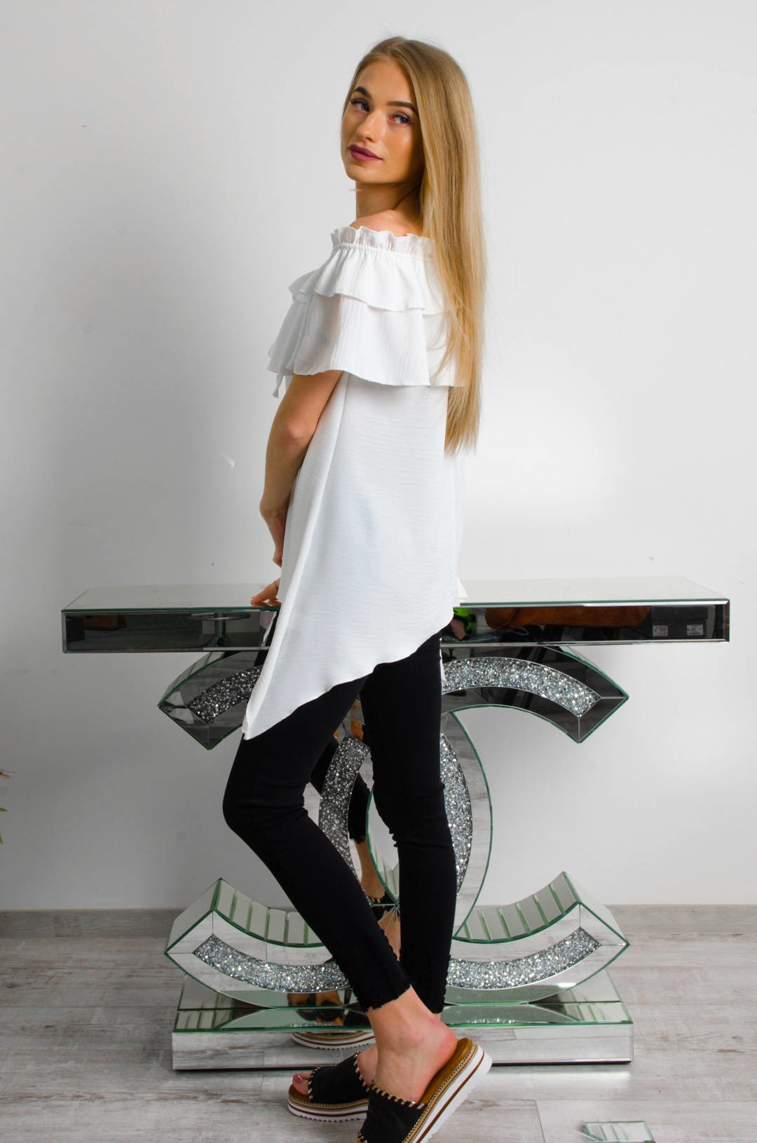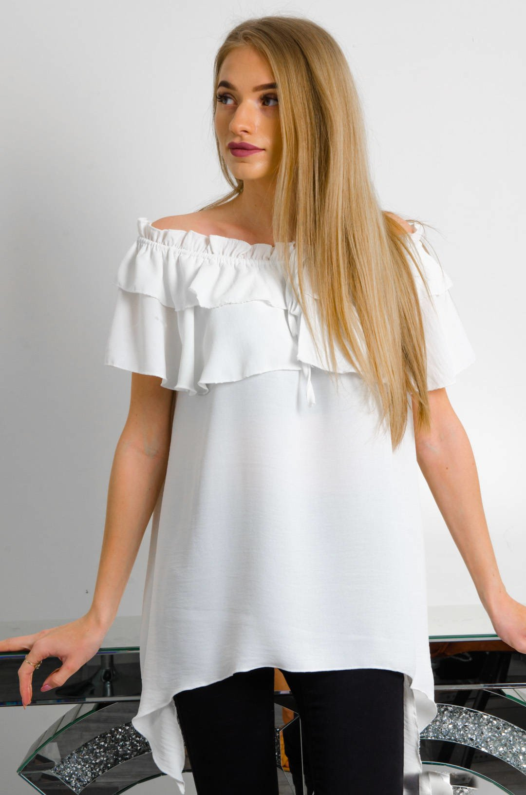 BIAŁA BLUZKA Z FALBANĄ ORAZ DŁUŻSZYMI BOKAMI