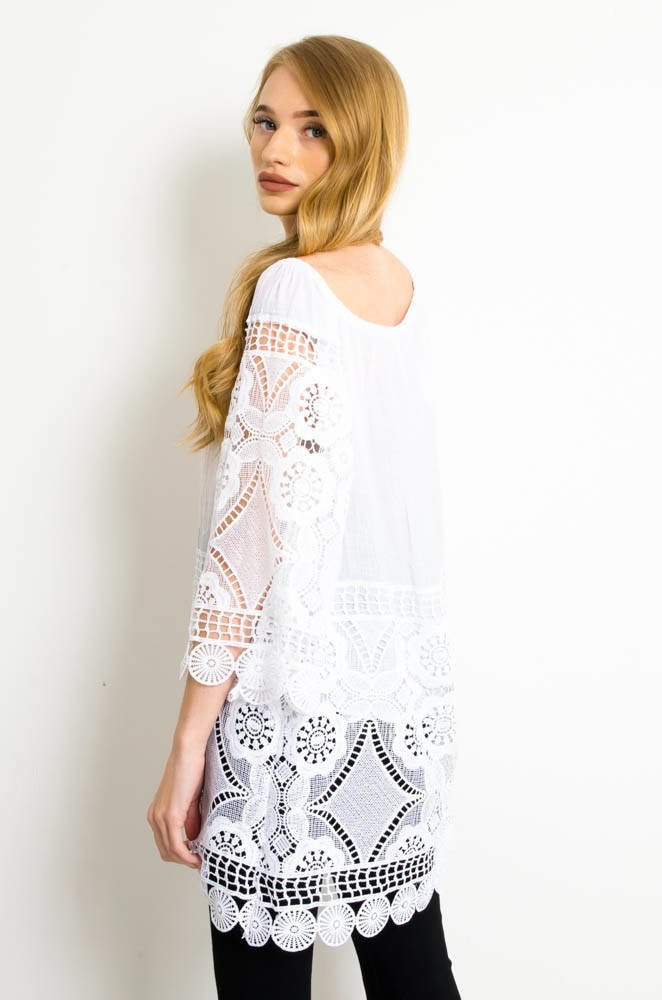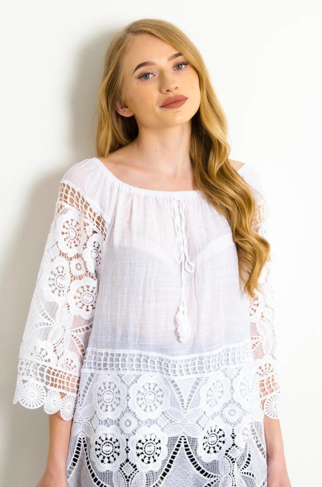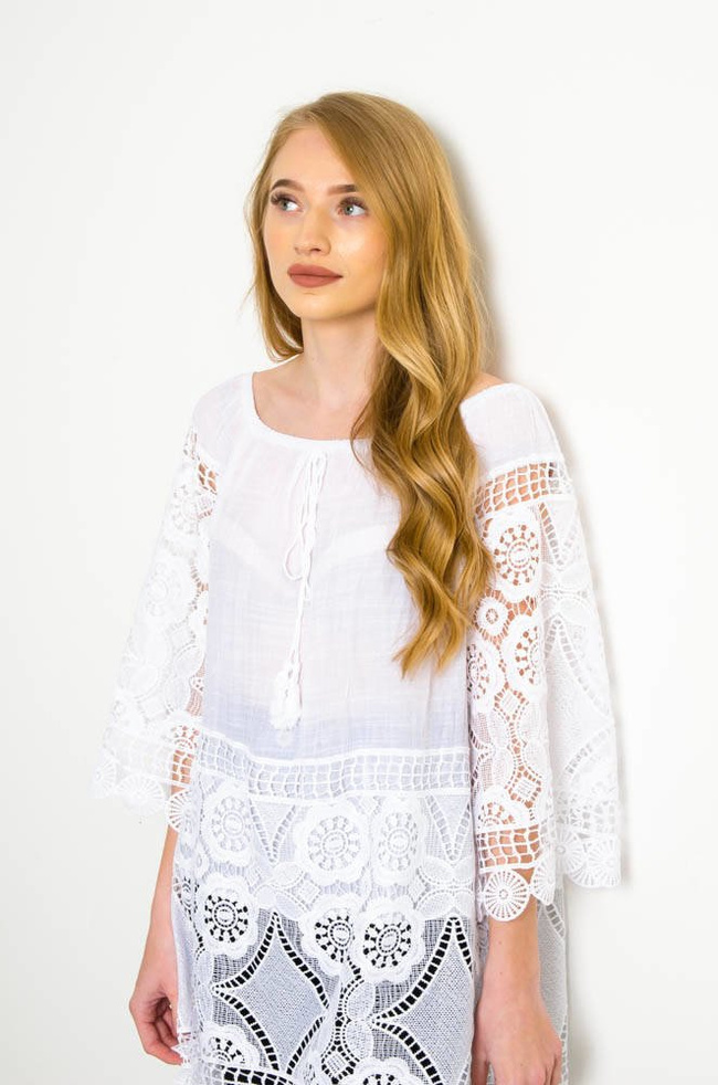 BIAŁA LUŹNA BLUZKA Z AŻUROWYMI WSTAWKAMI-WIĄZANA W DEKOLCIE