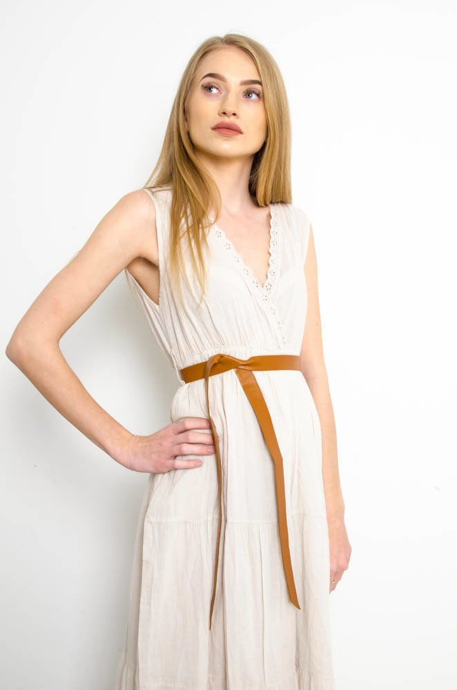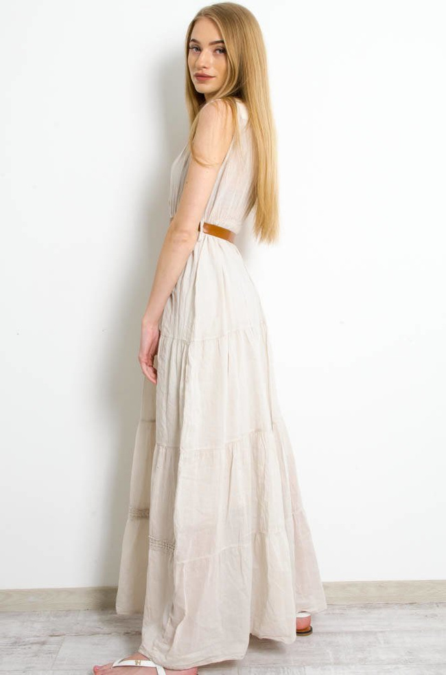 BEŻOWA SUKIENKA MAXI Z BRĄZOWYM PASKIEM-AŻUROWE WSTAWKI