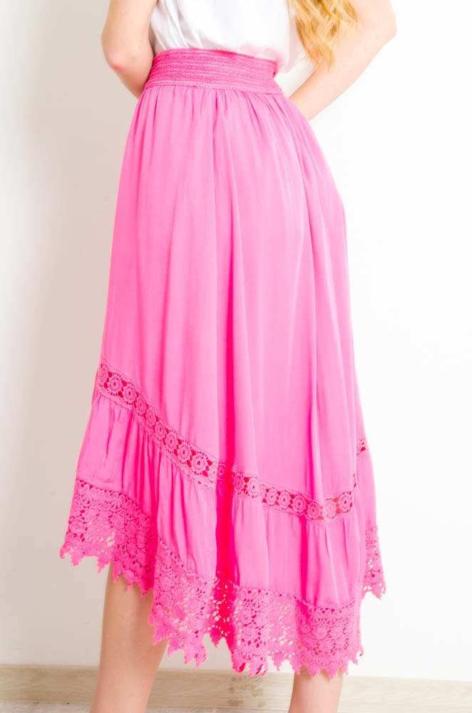 SPÓDNICA MIDI Z GUMĄ W PASIE ORAZ AŻUROWYM WYKOŃCZENIEM.