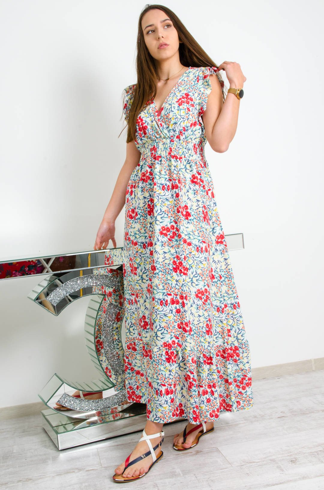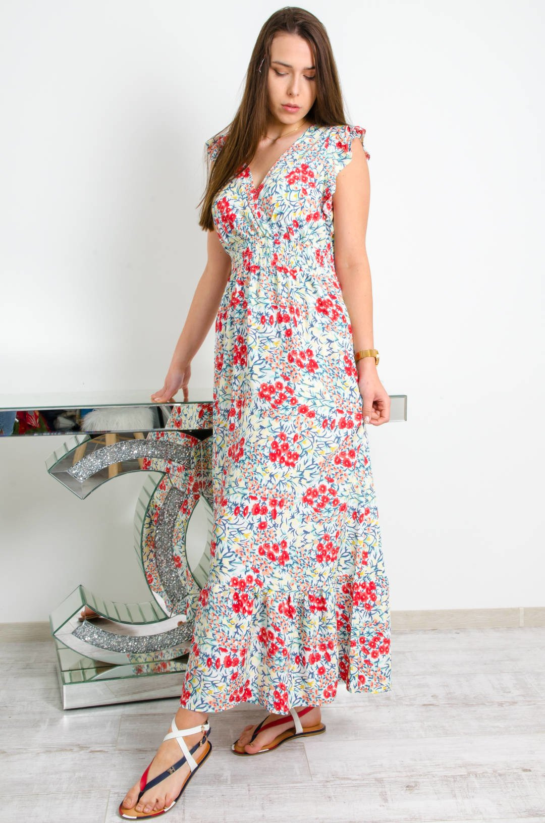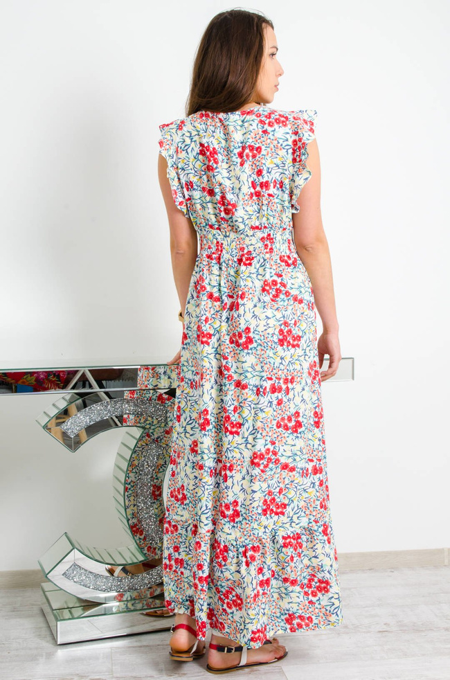 BIAŁA DŁUGA SUKIENKA W KWAIATY Z KOPERTOWYM DEKOLTEM