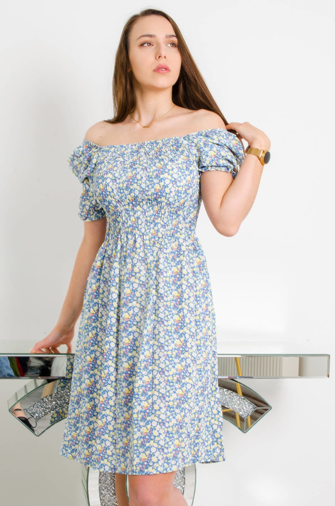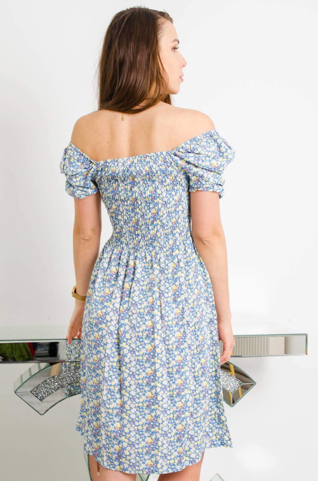 NIEBIESKA SUKIENKA W KWIATY Z BUFKAMI