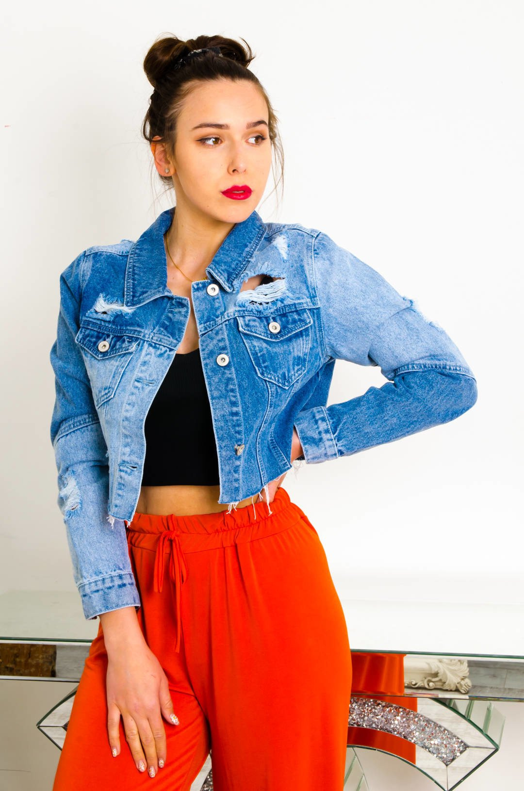 KRÓTKA KURTKA JEANSOWA Z ŁĄCZONYCH MATERIAŁÓW