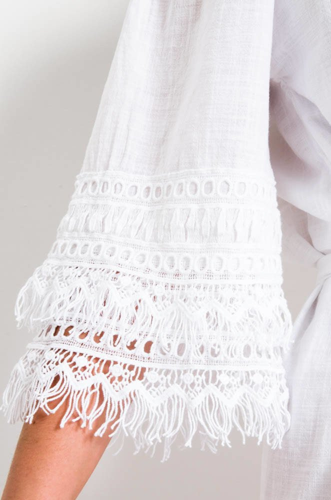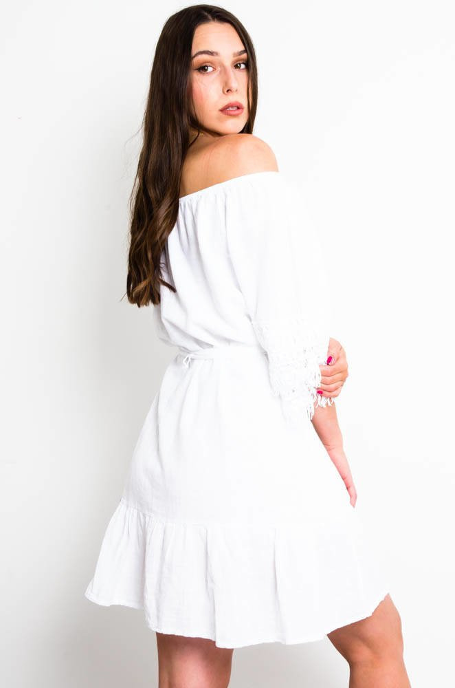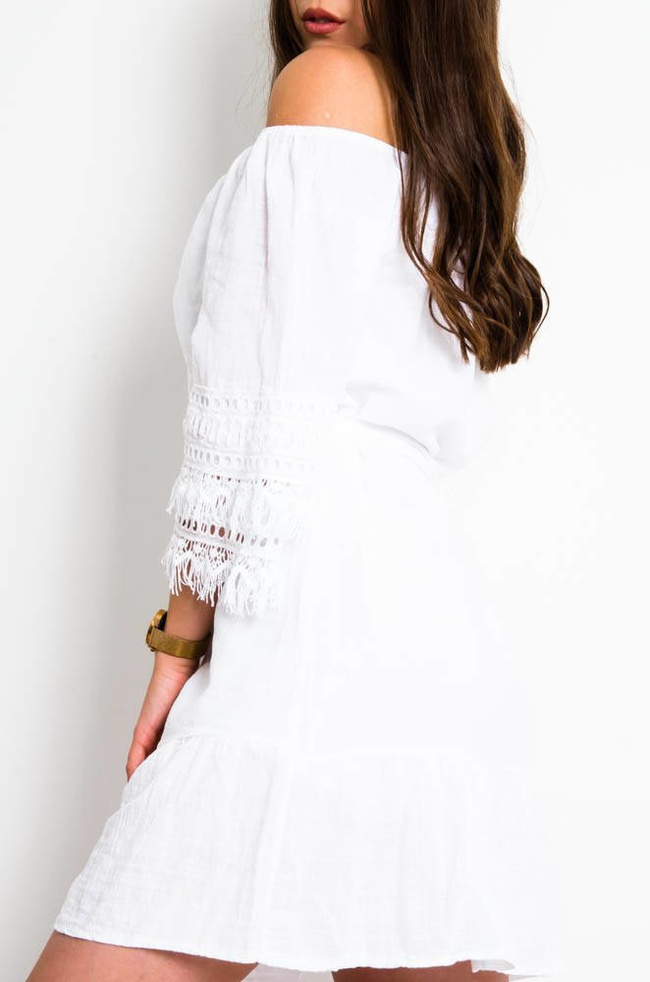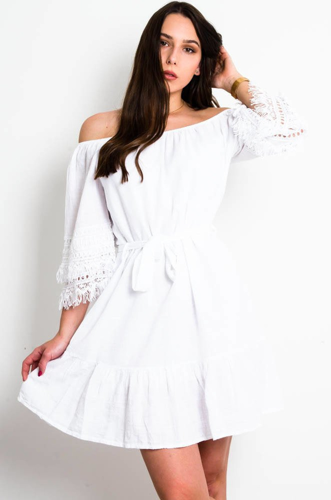BIAŁA BAWEŁNIANA SUKIENKA Z AŻUROWYM ZDOBIENIEM NA RĘKAWACH