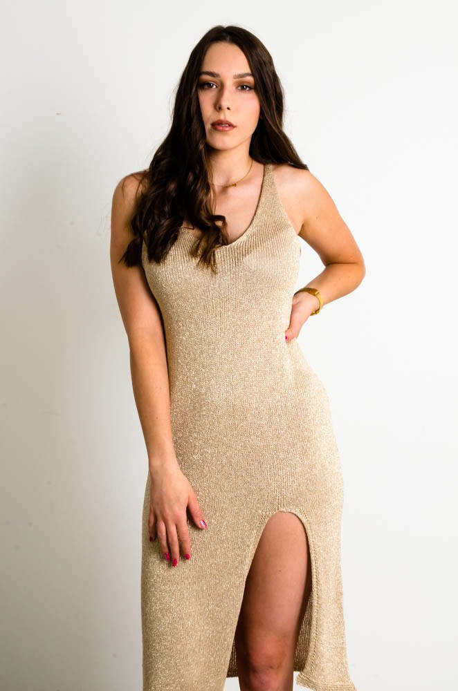 ZŁOTA DZIANINOWA SUKIENKA MAXI NA RAMIĄCZKACH Z ROZCIĘCIEM