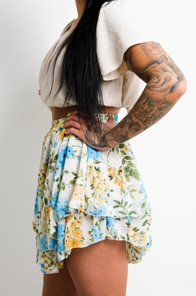 BIAŁA ROZKLOSZOWANA ZWIEWNA SPÓDNICA W KWIATY - KRÓTSZE BOKI