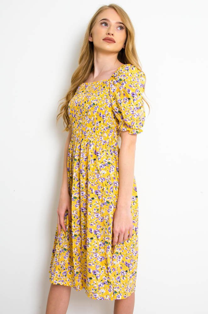 ŻÓŁTA SUKIENKA Z BUFKAMI W DROBNE FIOLETOWE KWIATY